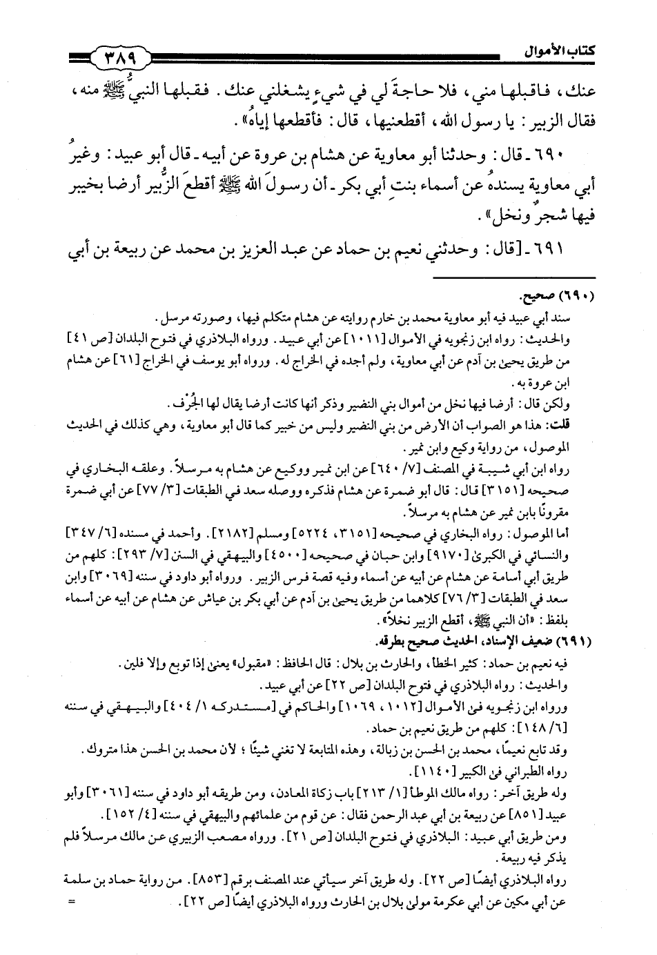 690 - (678) قَالَ: وَحَدَّثَنَا أَبُو مُعَاوِيَةَ، عَنْ هِشَامِ بْنِ عُرْوَةَ، عَنْ أَبِيهِ - قَالَ أَبُو عُبَيْدٍ: وَغَيْرُ أَبِي مُعَاوِيَةَ يُسْنِدُهُ عَنْ أَسْمَاءَ بِنْتِ أَبِي بَكْرٍ، أَنَّ رَسُولَ اللَّهِ صَلَّى اللهُ عَلَيْهِ وَسَلَّمَ أَقْطَعَ الزُّبَيْرَ أَرْضًا بِخَيْبَرَ فِيهَا شَجَرٌ وَنَخْلٌ.