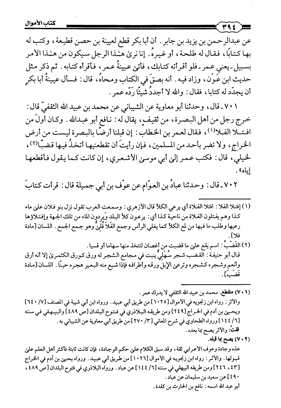701 - (689) قَالَ: وَحَدَّثَنَا أَبُو مُعَاوِيَةَ، عَنِ الشَّيْبَانِيِّ، عَنْ مُحَمَّدِ بْنِ عُبَيْدِ اللَّهِ الثَّقَفِيِّ، قَالَ: خَرَجَ رَجُلٌ مِنْ أَهْلِ الْبَصْرَةِ، مِنْ ثَقِيفٍ، يُقَالَ لَهُ نَافِعٌ أَبُو عَبْدِ اللَّهِ، وَكَانَ أَوَّلَ مَنِ افْتَلَا الْفَلَا، فَقَالَ لِعُمَرَ بْنِ الْخَطَّابِ: إِنَّ قِبَلَنَا أَرْضًا بِالْبَصْرَةِ لَيْسَتْ مِنْ أَرْضِ الْخَرَاجِ، وَلَا تَضُرُّ بِأَحَدٍ مِنَ الْمُسْلِمِينَ، فَإِنْ رَأَيْتَ أَنْ تُقْطِعَنِيهَا أَتَّخِذُ فِيهَا قَضْبًا لِخَيْلِي، قَالَ: فَكَتَبَ عُمَرُ إِلَى أَبِي مُوسَى الْأَشْعَرِيِّ: إِنْ كَانَتْ كَمَا يَقُولُ فَأَقْطِعْهَا إِيَّاهُ.