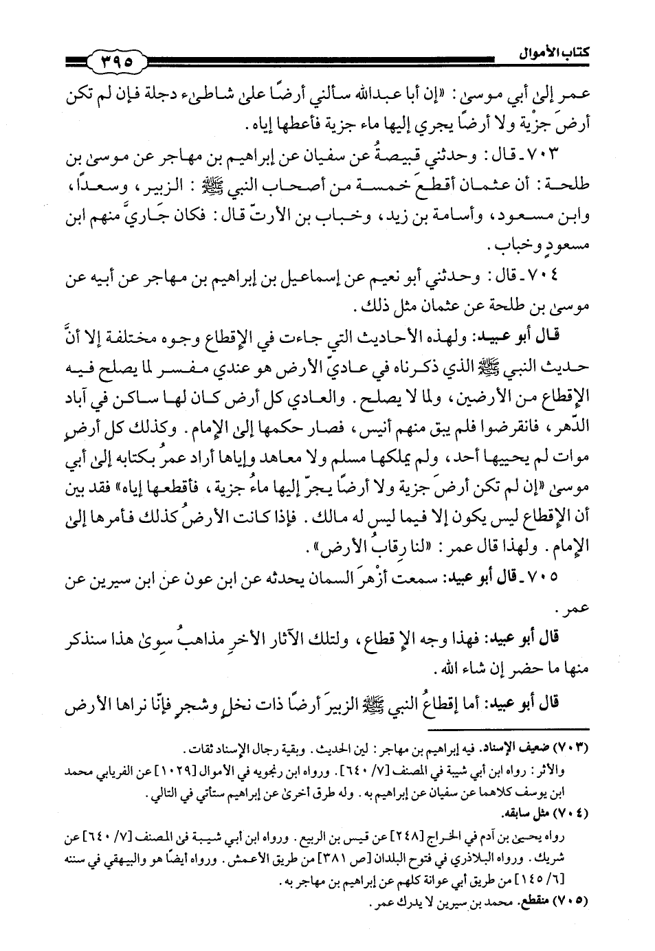 قَالَ أَبُو عُبَيْدٍ: فَهَذَا وَجْهُ الْإِقْطَاعِ، وَلِتِلْكَ الْآثَارِ الْأُخَرِ مَذَاهِبُ سِوَى هَذَا، سَنَذْكُرُ مِنْهَا مَا حَضَرَ إِنْ شَاءَ اللَّهُ. قَالَ أَبُو عُبَيْدٍ: أَمَّا إِقْطَاعُ النَّبِيِّ صَلَّى اللهُ عَلَيْهِ وَسَلَّمَ الزُّبَيْرَ أَرْضًا ذَاتَ نَخْلٍ وَشَجَرٍ، فَإِنَّا نَرَاهَا الْأَرْضَ #396# الَّتِي كَانَ رَسُولُ اللَّهِ صَلَّى اللهُ عَلَيْهِ وَسَلَّمَ أَقْطَعَهَا الْأَنْصَارِيَّ فَأَحْيَاهَا وَعَمَّرَهَا، ثُمَّ تَرَكَهَا بِطِيبِ نَفْسٍ مِنْهُ، فَقَطَعَهَا رَسُولُ اللَّهِ صَلَّى اللهُ عَلَيْهِ وَسَلَّمَ لِلزُّبَيْرِ، وَهُوَ مُفَسَّرٌ فِي حَدِيثِ ابْنِ سِيرِينَ الَّذِي ذَكَرْنَاهُ، فَإِنْ لَمْ تَكُنْ تِلْكَ فَلَعَلَّهَا مِمَّا اصْطَفَى رَسُولُ اللَّهِ صَلَّى اللهُ عَلَيْهِ وَسَلَّمَ مِنْ خَيْبَرَ، فَقَدْ كَانَ لَهُ مِنْ كُلِّ غَنِيمَةٍ الصَّفِيُّ وَخُمْسُ الْخُمُسِ، وَقَدْ ذَكَرْنَا مَا كَانَ لَهُ خَاصًّا مِنَ الْغَنَائِمِ فِي أَوَّلِ الْكِتَابِ، فَإِنْ كَانَتْ أَرْضُ الزُّبَيْرِ مِنْ ذَلِكَ فَهِيَ مِلْكُ يَمِينِ النَّبِيِّ صَلَّى اللهُ عَلَيْهِ وَسَلَّمَ، يُعْطِيهَا مَنْ شَاءَ عَامِرَةً وَغَيْرَ عَامِرَةٍ، وَلَا أَعْرِفُ لِإِقْطَاعِهِ أَرْضًا فِيهَا نَخْلٌ وَشَجَرٌ وَجْهًا غَيْرَ هَذَا، وَأَمَّا الْقَرْيَاتُ الَّتِي جَعَلَهَا لِتَمِيمٍ الدَّارِيِّ، وَهِيَ أَرْضٌ مَعْمُورَةٌ لَهَا أَهْلٌ، فَإِنَّمَا ذَلِكَ عَلَى وَجْهِ النَّفَلِ لَهُ مِنْ رَسُولِ اللَّهِ صَلَّى اللهُ عَلَيْهِ وَسَلَّمَ، لِأَنَّ هَذَا كَانَ قَبْلَ أَنْ تُفْتَحَ الشَّامُ، وَقَبْلَ أَنْ يَمْلِكَهَا الْمُسْلِمُونِ، فَجَعَلَهَا لَهُ نَفَلًا مِنْ أَمْوَالِ أَهْلِ الْحَرْبِ، إِذَا ظَهَرَ عَلَيْهَا، وَهَذَا كَفِعْلِهِ بِابْنَةِ بَقِيلَةَ عَظِيمِ الْحِيرَةِ حِينَ سَأَلَهُ إِيَّاهَا الشَّيْبَانِيُّ، فَجَعَلَهَا لَهُ قَبْلَ افْتِتَاحِ الْحِيرَةِ، فَأَمْضَاهَا لَهُ خَالِدُ بْنُ الْوَلِيدِ حِينَ ظَهَرَ عَلَيْهَا، وَقَدْ ذَكَرْنَا حَدِيثَهَا فِي كِتَابِ الصُّلْحِ، وَكَذَلِكَ إِمْضَاءُ عُمَرَ لِتَمِيمٍ حِينَ افْتَتَحَ فِلَسْطِينَ عَلَى مَا كَانَ رَسُولُ اللَّهِ صَلَّى اللهُ عَلَيْهِ وَسَلَّمَ نَفَّلَ تَمِيمًا. وَقَدْ عَمِلَ عُمَرُ فِي السَّوَادِ بِمِثْلِ هَذَا، حِينَ جَعَلَ لِجَرِيرِ بْنِ عَبْدِ اللَّهِ مِنْهُ الثُّلُثَ، أَوِ الرُّبُعَ، عِنْدَ تَوْجِيهِهِ إِيَّاهُ إِلَى الْعِرَاقِ، وَقَدْ ذَكَرْنَا حَدِيثَهُ فِي فَتْحِ السَّوَادِ، كَذَلِكَ الْأَرْضُ الَّتِي كَتَبَ بِهَا رَسُولُ اللَّهِ صَلَّى اللهُ عَلَيْهِ وَسَلَّمَ لِأَبِي ثَعْلَبَةَ الْخُشَنِيِّ، وَهِيَ بِأَيْدِي الرُّومِ يَوْمَئِذٍ، قِصَّتُهَا عِنْدِي كِقِصَّةِ قُرَى تَمِيمٍ، وَأَمَّا إِقْطَاعَهُ فُرَاتَ بْنَ حَيَّانَ الْعِجْلِيَّ أَرْضًا بِالْيَمَامَةِ فَغَيْرُ هَذَا، وَذَلِكَ أَنَّ الْيَمَامَةَ قَدْ كَانَ بِهَا إِسْلَامٌ عَلَى عَهْدِ النَّبِيِّ صَلَّى اللهُ عَلَيْهِ وَسَلَّمَ، وَقَدِمَ وَفْدُ بَنِي حَنِيفَةَ عَلَيْهِ، مِنْهُمْ مُجَّاعَةُ بْنُ مُرَارَةَ، وَالرَّجَّالُ بْنُ عُنْفُوَةَ، وَمُحَكِّمُ بْنُ الطُّفَيْلِ فَأَسْلَمُوا وَأَقْطَعَ رَسُولُ اللَّهِ صَلَّى اللهُ عَلَيْهِ وَسَلَّمَ مُجَّاعَةَ أَرْضًا.