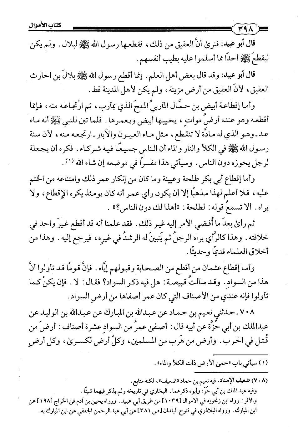 قَالَ أَبُو عُبَيْدٍ: فَنَرَى أَنَّ الْعَقِيقَ مِنْ ذَلِكَ، فَقَطَعَهَا رَسُولُ اللَّهِ صَلَّى اللهُ عَلَيْهِ وَسَلَّمَ لِبِلَالٍ، وَلَمْ يَكُنْ لِيُقْطِعَ صَلَّى اللهُ عَلَيْهِ وَسَلَّمَ أَحَدًا [شيئاً] * مِمَّا أَسْلَمُوا عَلَيْهِ إِلَّا بِطِيبِ أَنْفُسِهِمْ. قَالَ أَبُو عُبَيْدٍ: وَقَدْ قَالَ بَعْضُ أَهْلِ الْعِلْمِ: إِنَّمَا أَقْطَعَ رَسُولُ اللَّهِ صَلَّى اللهُ عَلَيْهِ وَسَلَّمَ بِلَالَ بْنَ الْحَارِثِ الْعَقِيقَ؛ لِأَنَّ الْعَقِيقَ مِنْ أَرْضِ مُزَيْنَةَ، وَلَمْ يَكُنْ لِأَهْلِ الْمَدِينَةِ قَطُّ، وَأَمَّا إِقْطَاعُهُ أَبْيَضَ بْنَ حَمَّالٍ الْمَارِبِيَّ الْمِلْحَ الَّذِي بِمَارِبَ، ثُمَّ ارْتِجَاعُهُ مِنْهُ، فَإِنَّمَا أَقْطَعَهُ وَهُوَ عِنْدَهُ أَرْضٌ مَوَاتٌ، يُحْيِيهَا أَبْيَضُ وَيُعَمِّرُهَا، فَلَمَّا تَبَيَّنَ لِلنَّبِيِّ صَلَّى اللهُ عَلَيْهِ وَسَلَّمَ أَنَّهُ مَاءٌ عَدَّ - وَهُوَ الَّذِي لَهُ مَادَّةٌ لَا تَنْقَطِعُ، مِثْلَ مَاءِ الْعُيُونِ وَالْآبَارِ - ارْتَجَعَهُ مِنْهُ، لِأَنَّ سُنَّةَ رَسُولِ اللَّهِ صَلَّى اللهُ عَلَيْهِ وَسَلَّمَ فِي الْكَلَأِ وَالنَّارِ وَالْمَاءِ أَنَّ النَّاسَ جَمِيعًا فِيهِ شُرَكَاءُ، فَكَرِهَ أَنْ يَجْعَلَهُ لِرَجُلٍ يَحُوزَهُ دُونَ النَّاسِ، وَسَيَاتِي هَذَا مُفَسَّرًا فِي مَوْضِعِهِ إِنْ شَاءَ اللَّهُ. وَأَمَّا إِقْطَاعُ أَبِي بَكْرٍ طَلْحَةَ وَعُيَيْنَةَ، وَمَا كَانَ مِنْ إِنْكَارِ عُمَرَ ذَلِكَ، وَامْتِنَاعِهِ منِ الْخَتْمِ عَلَيْهِ، فَلَا أَعْلَمُ لِهَذَا مَذْهَبًا إِلَّا أَنْ يَكُونَ رَايُ عُمَرَ أَنَّهُ كَانَ يَوْمَئِذٍ يَكْرَهُ الْإِقْطَاعَ، وَلَا يَرَاهُ، أَلَا تَسْمَعُ قَوْلَهُ: لِطَلْحَةَ: أَهَذَا لَكَ دُونَ النَّاسِ؟ ثُمَّ رَأَى بَعْدَمَا أَفْضَى الْأَمْرُ إِلَيْهِ غَيْرَ ذَلِكَ، فَقَدْ عَلِمْنَا أَنَّهُ قَدْ أَقَطَعَ غَيْرَ وَاحِدٍ فِي خِلَافَتِهِ، وَهَذَا كَالرَّايِ يَرَاهُ الرَّجُلُ ثُمَّ يَتَبَيَّنُ لَهُ الرُّشْدُ فِي غَيْرِهِ، فَيَرْجِعُ إِلَيْهِ، وَهَذَا مِنْ أَخْلَاقِ الْعُلَمَاءِ قَدِيمًا وَحَدِيثًا. وَأَمَّا إِقْطَاعُ عُثْمَانَ مَنْ أَقْطَعَ مِنَ الصَّحَابَةِ وَقَبُولُهُمْ إِيَّاهُ، فَإِنَّ قَوْمًا قَدْ تَأَوَّلُوا أَنَّ هَذَا مِنَ السَّوَادِ، وَقَدْ سَأَلْتُ قَبِيصَةَ: هَلْ كَانَ فِيهِ ذِكْرُ السَّوَادِ؟ فَقَالَ: لَا، فَإِنْ يَكُنْ كَمَا تَأَوَّلُوا فَإِنَّهُ عِنْدِي مِنَ الْأَصْنَافِ الَّتِي كَانَ عُمَرُ أَصْفَاهَا مِنْ أَرْضِ السَّوَادِ.