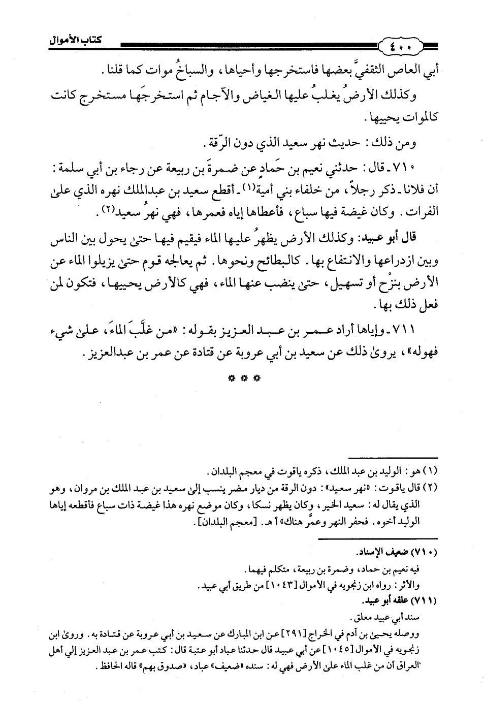 710 - (700) قَالَ: حَدَّثَنِي نُعَيْمُ بْنُ حَمَّادٍ، عَنْ ضَمْرَةَ بْنِ رَبِيعَةَ، عَنْ رَجَاءِ بْنِ أَبِي سَلَمَةَ، أَنَّ فُلَانًا - ذَكَرَ رَجُلًا مِنْ خُلَفَاءِ بَنِي أُمَيَّةَ - أَقْطَعَ سَعِيدَ بْنَ عَبْدِ الْمَلِكِ نَهْرَهُ الَّذِي عَلَى الْفُرَاتِ، وَكَانَ غَيْضَةً فِيهَا سِبَاعٌ، فَأَعْطَاهَا إِيَّاهُ فَعَمَّرَهَا، فَهِيَ نَهْرُ سَعِيدٍ.