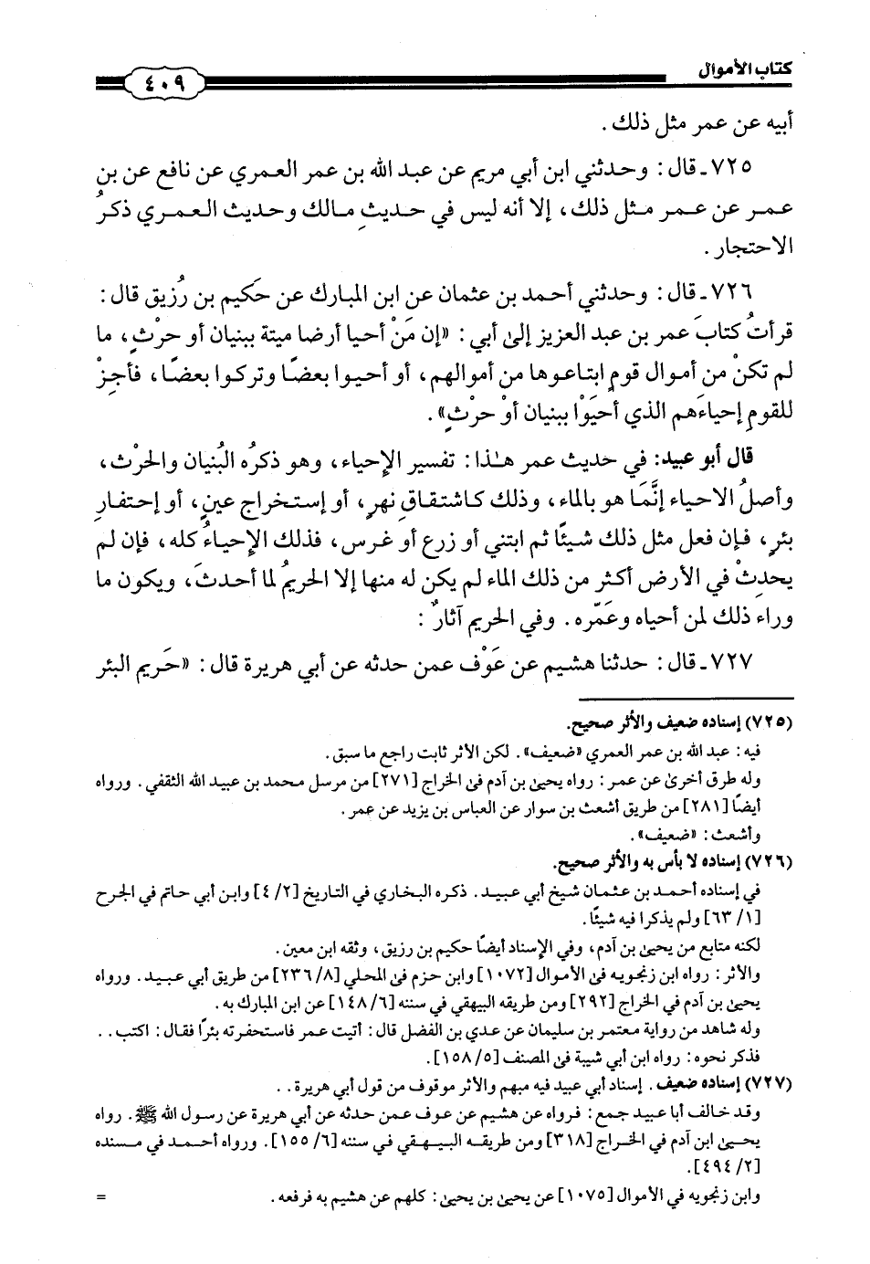 726 - (717) قَالَ: وَحَدَّثَنِي أَحْمَدُ بْنُ عُثْمَانَ، عَنِ ابْنِ الْمُبَارَكِ، عَنْ حَكِيمِ بْنِ رُزَيْقٍ، قَالَ: قَرَاتُ كِتَابَ عُمَرَ بْنِ عَبْدِ الْعَزِيزِ إِلَى أَبِي: إِنَّ «مَنْ أَحْيَا أَرْضًا مَيْتَةً بِبُنْيَانٍ أَوْ حَرْثٍ، مَا لَمْ تَكُنْ مِنْ أَمْوَالِ قَوْمٍ ابْتَاعُوهَا مِنْ أَمْوَالِهِمْ، أَوْ أَحْيَوْا بَعْضًا وَتَرَكُوا بَعْضًا، فَأَجِزْ لِلْقَوْمِ إِحْيَاءَهُمُ الَّذِي أَحْيَوْا بِبُنْيَانٍ أَوْ حَرْثٍ».