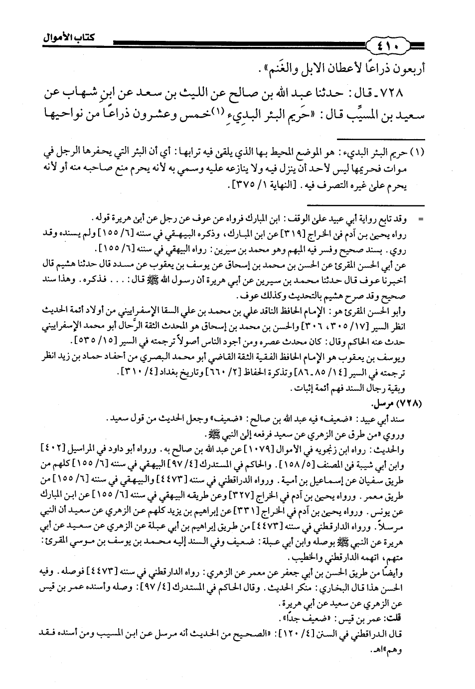 728 - (729) قَالَ: حَدَّثَنَا عَبْدُ اللَّهِ بْنُ صَالِحٍ، عَنِ اللَّيْثِ بْنِ سَعْدٍ، عَنِ ابْنِ شِهَابٍ، عَنْ سَعِيدِ بْنِ الْمُسَيِّبِ، قَالَ: حَرِيمُ الْبِئْرِ الْبَدِيءُ خَمْسٌ وَعِشْرُونَ ذِرَاعًا مِنْ نَوَاحِيهَا #411# كُلِّهَا، وَحَرِيمُ بِئْرِ الزَّرْعِ ثَلَاثُمِائَةِ ذِرَاعٍ مِنْ نَوَاحِيهَا كُلِّهَا، وَحَرِيمُ الْبِئْرِ الْعَادِيَّةِ خَمْسُونَ ذِرَاعًا مِنْ نَوَاحِيهَا كُلِّهَا قَالَ: قَالَ ابْنُ شِهَابٍ: وَسَمِعْتُ النَّاسَ يَقُولُونَ: وَحَرِيمُ الْعَيْنِ لِخَمْسِمِائَةِ ذِرَاعٍ.