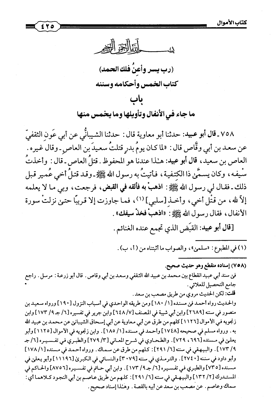 758 - (756) قَالَ أَبُو عُبَيْدٍ: حَدَّثَنَا أَبُو مُعَاوِيَةَ، قَالَ: حَدَّثَنَا الشَّيْبَانِيُّ، عَنْ أَبِي عَوْنٍ الثَّقَفِيِّ، عَنْ سَعْدِ بْنِ أَبِي وَقَّاصٍ، قَالَ: لَمَّا كَانَ يَوْمُ بَدْرٍ قَتَلْتُ سَعِيدَ بْنَ الْعَاصِ وَقَالَ غَيْرُهُ: الْعَاصَ بْنَ سَعِيدٍ - قَالَ أَبُو عُبَيْدٍ: هَذَا عِنْدَنَا هُوَ الْمَحْفُوظُ، قَتْلُ الْعَاصِ - قَالَ: وَأَخَذْتُ سَيْفَهُ، وَكَانَ يُسَمَّى ذَا الْكَتِيفَةِ، فَأَتَيْتُ بِهِ رَسُولَ اللَّهِ صَلَّى اللهُ عَلَيْهِ وَسَلَّمَ: وَقَدْ قَتَلَ أَخِي عُمَيْر قَبْلَ ذَلِكَ، فَقَالَ لِي رَسُولُ اللَّهِ صَلَّى اللهُ عَلَيْهِ وَسَلَّمَ: اذْهَبْ بِهِ فَأَلْقِهِ فِي الْقَبْضِ، فَرَجَعْتُ وَبِي مَا لَا يَعْلَمُهُ إِلَّا اللَّهُ، مِنْ قَتْلِ أَخِي، وَأَخْذِ سَلَبِي، فَمَا جَاوَزْتُ إِلَّا قَرِيبًا حَتَّى نَزَلَتْ سُورَةُ الْأَنْفَالِ، فَقَالَ رَسُولُ اللَّهِ صَلَّى اللهُ عَلَيْهِ وَسَلَّمَ: اذْهَبْ فَخُذْ سَيْفَكَ.