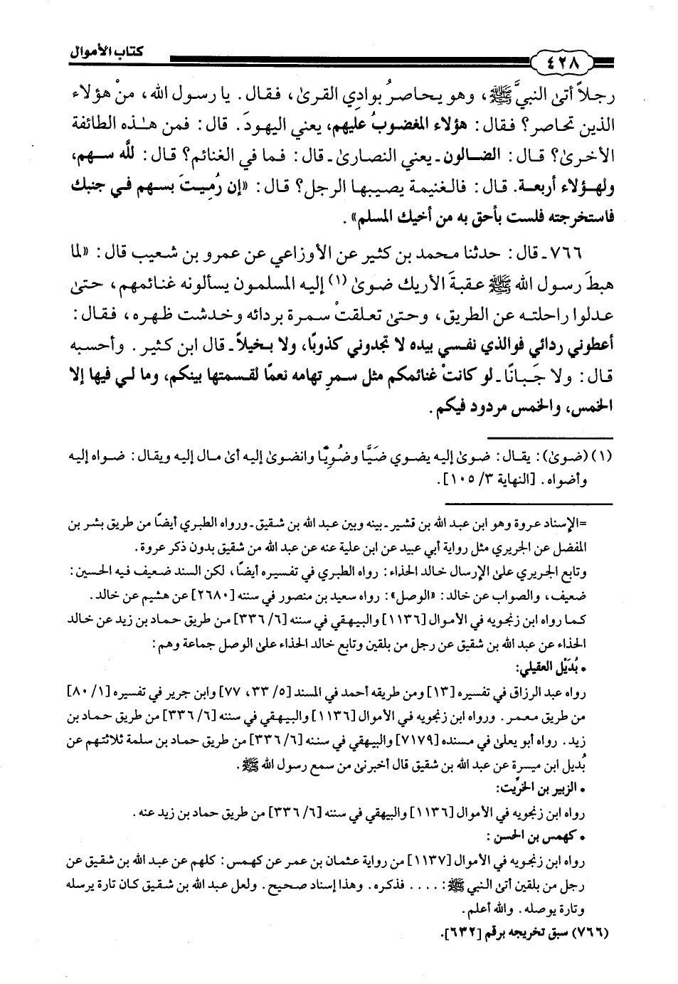 766 - قَالَ: حَدَّثَنَا مُحَمَّدِ بْنُ كَثِيرٍ، عَنِ الْأَوْزَاعِيِّ، عَنْ عَمْرِو بْنِ شُعَيْبٍ، قَالَ: لَمَّا هَبَطَ رَسُولُ اللَّهِ صَلَّى اللهُ عَلَيْهِ وَسَلَّمَ عَقَبَةَ الْأَرِيكِ ضَوَى إِلَيْهِ الْمُسْلِمُونَ يَسْأَلُونَهُ غَنَائِمَهُمْ، حَتَّى عَدَلُوا رَاحِلَتَهُ عَنِ الطَّرِيقِ، وَحَتَّى تَعَلَّقَتْ سَمُرَةٌ بِرِدَائِهِ وَخَدَشَتْ ظَهْرَهُ، فَقَالَ: أَعْطُونِي رِدَائِي، فَوَالَّذِي نَفْسِي بِيَدِهِ لَا تَجِدُونِي كَذُوبًا، وَلَا بَخِيلًا - قَالَ ابْنُ كَثِيرٍ: وَأَحْسِبُهُ قَالَ: وَلَا جَبَانًا - لَوْ كَانَتْ غَنَائِمِكُمْ مِثْلَ سَمُرِ تِهَامَةَ نَعَمًا لَقَسَمْتُهَا بَيْنَكُمْ، وَمَا لِي فِيهَا إِلَّا الْخُمُسُ، وَالْخُمُسُ مَرْدُودٌ فِيكُمْ.