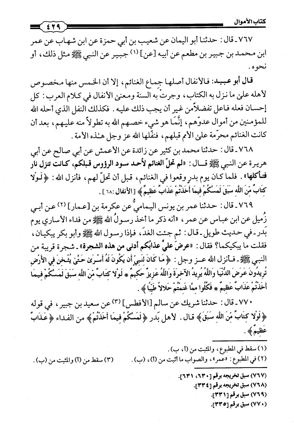768 - (768) قَالَ: حَدَّثَنَا مُحَمَّدُ بْنُ كَثِيرٍ، عَنْ زَائِدَةَ، عَنِ الْأَعْمَشِ، عَنْ أَبِي صَالِحٍ، عَنْ أَبِي هُرَيْرَةَ، عَنِ النَّبِيِّ صَلَّى اللهُ عَلَيْهِ وَسَلَّمَ، قَالَ: " لَمْ تَحِلَّ الْغَنَائِمُ لِأَحَدِ سُودِ الرُّءُوسِ قَبْلَكُمْ، كَانَتْ تَنْزِلُ نَارٌ فَتَاكُلُهَا، فَلَمَّا كَانَ يَوْمُ بَدْرٍ وَقَعُوا فِي الْغَنَائِمِ، قَبْلَ أَنْ تَحِلَّ لَهُمْ، فَأَنْزَلَ اللَّهُ: {لَوْلَا كِتَابٌ مِنَ اللَّهِ سَبَقَ لَمَسَّكُمْ فِيمَا أَخَذْتُمْ عَذَابٌ عَظِيمٌ} [الأنفال: 68] ".