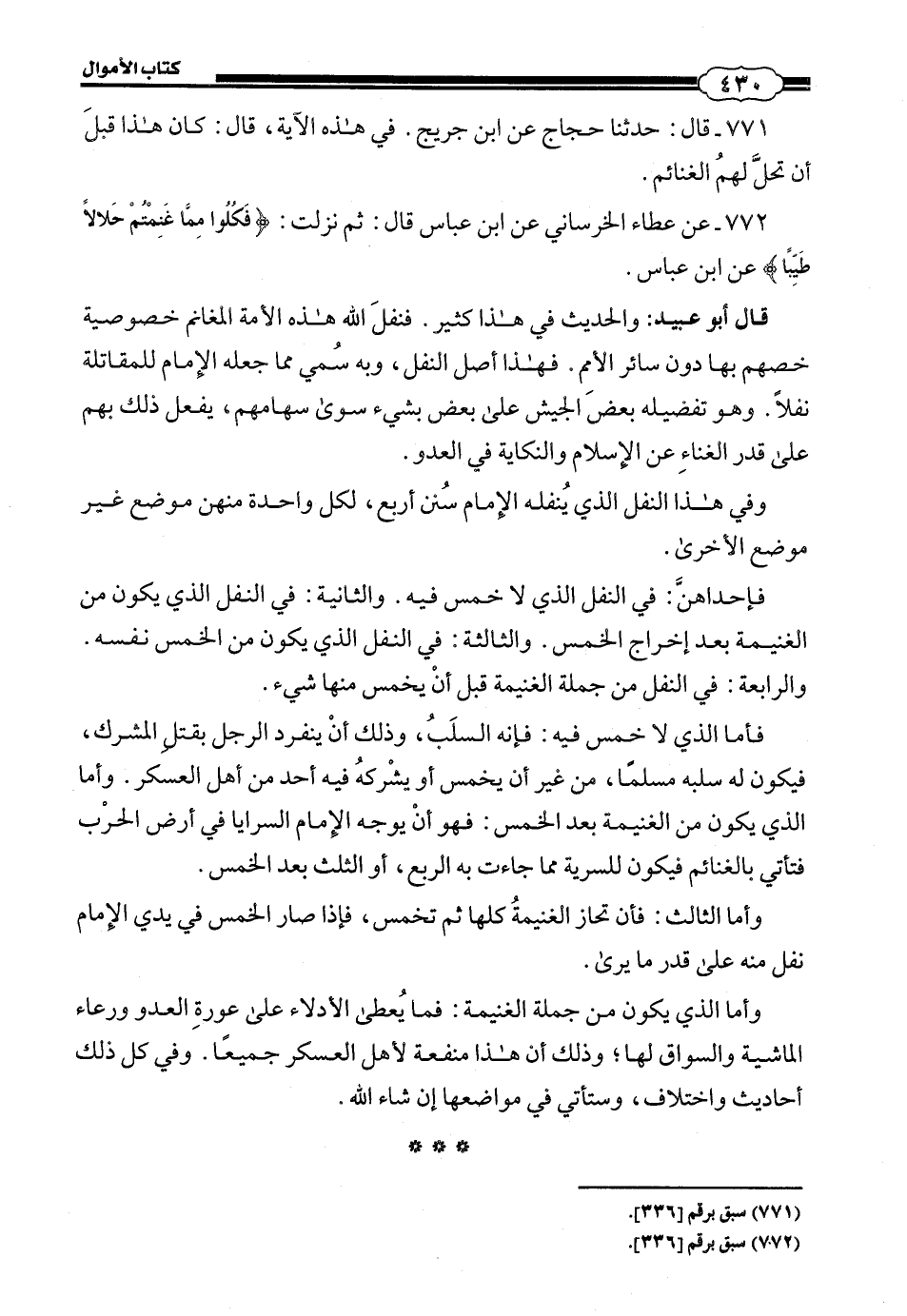 قَالَ أَبُو عُبَيْدٍ: وَالْحَدِيثُ فِي هَذَا كَثِيرٌ، فَنَفْلُ اللَّهِ هَذِهِ الْأُمَّةَ الْمَغَانِمَ خُصُوصِيَّةً خَصَّهُمْ بِهَا دُونَ سَائِرِ الْأُمَمِ، فَهَذَا أَصْلُ النَّفَلِ، وَبِهِ سُمِيَّ مَا جَعَلَهُ الْإِمَامُ لِلْمُقَاتِلَةٍ نَفْلًا، وَهُوَ تَفْضِيلُهُ بَعْضَ الْجَيْشِ عَلَى بَعْضٍ بِشَيْءٍ سِوَى سِهَامِهِمْ، يَفْعَلُ ذَلِكَ بِهِمْ عَلَى قَدْرِ الْغَنَاءِ عَنِ الْإِسْلَامِ وَالنِّكَايَةِ فِي الْعَدُوِّ، وَفِي هَذَا النَّفَلِ الَّذِي يُنَفِّلُهُ الْإِمَامُ سُنَنٌ أَرْبَعٌ، لِكُلِّ وَاحِدَةٍ مِنْهُنَّ مَوْضِعٌ غَيْرُ مَوْضِعِ الْأُخْرَى. فَإِحْدَاهُنَّ فِي النَّفَلِ الَّذِي لَا خُمُسَ فِيهِ. وَالثَّانِيَةُ: فِي النَّفَلِ الَّذِي يَكُونُ مِنَ الْغَنِيمَةِ بَعْدَ إِخْرَاجِ الْخُمُسِ. وَالثَّالِثَةُ: فِي النَّفَلِ الَّذِي يَكُونُ مِنَ الْخُمُسِ نَفْسِهِ. وَالرَّابِعَةُ فِي النَّفَلِ مِنْ جُمْلَةِ الْغَنِيمَةِ قَبْلَ أَنْ يُخَمَّسَ مِنْهَا شَيْءٌ، فَأَمَّا الَّذِي لَا خُمُسَ فِيهِ فَإِنَّهُ السَّلَبُ، وَذَلِكَ أَنْ يَنْفَرِدَ الرَّجُلُ بِقَتْلِ الْمُشْرِكِ، فَيَكُونُ لَهُ سَلَبُهُ مُسْلِمًا، مِنْ غَيْرِ أَنْ يُخَمِّسَ أَوْ يُشْرِكَهُ فِيهِ أَحَدٌ مِنْ أَهْلِ الْعَسْكَرِ، وَأَمَّا الَّذِي يَكُونُ مِنَ الْغَنِيمَةِ بَعْدَ الْخُمُسِ، فَهُوَ أَنْ يُوَجِّهَ الْإِمَامُ السَّرَايَا فِي أَرْضِ الْحَرْبِ، فَتَاتِي بِالْغَنَائِمِ فَيَكُونُ لِلسَّرِيَّةِ مِمَّا جَاءَتْ بِهِ الرُّبُعُ، أَوِ الثُّلُثُ بَعْدَ الْخُمُسِ. وَأَمَّا الثَّالِثُ فَأَنْ تُحَازَ الْغَنِيمَةُ كُلُّهَا ثُمَّ تُخَمَّسُ، فَإِذَا صَارَ الْخُمُسُ فِي يَدَيِ الْإِمَامِ نَفَلَ مِنْهُ عَلَى قَدْرِ مَا يَرَى. وَأَمَّا الَّذِي يَكُونُ مِنْ جُمْلَةِ الْغَنِيمَةِ فَمَا يُعْطِي الْأَدِلَّاءُ عَلَى عَوْرَةِ الْعَدُوِّ، وَرِعَاءِ الْمَاشِيَةِ وَالسُّوَّاقُ لَهَا، وَذَلِكَ أَنَّ هَذَا مَنْفَعَةٌ لِأَهْلِ الْعَسْكَرِ جَمِيعًا، وَفِي كُلِّ ذَلِكَ أَحَادِيثُ وَاخْتِلَافٌ، وَسَتَاتِي فِي مَوَاضِعِهَا إِنْ شَاءَ اللَّهُ.