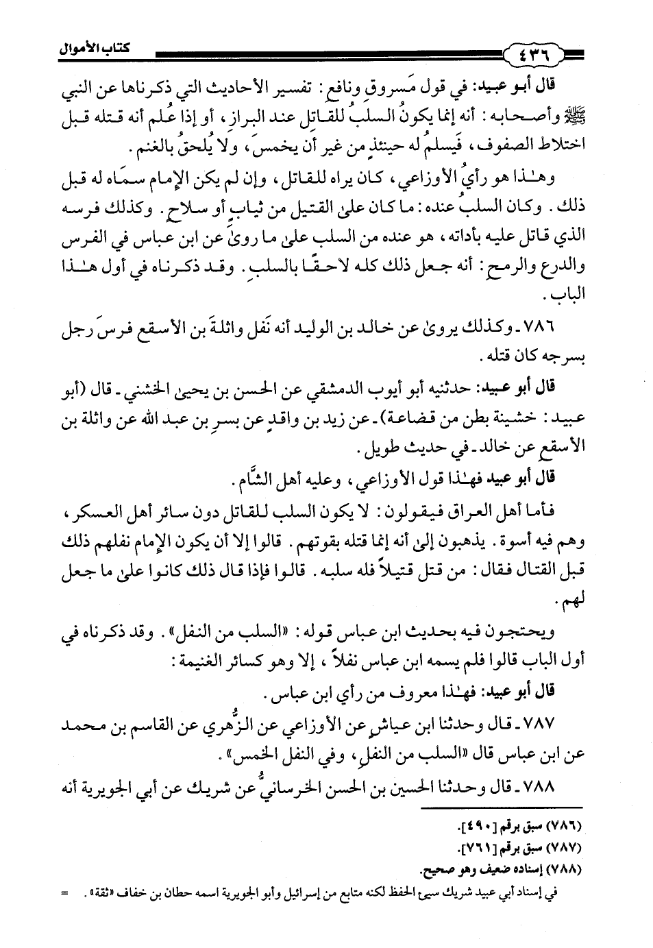 787 - (790) قَالَ: وَحَدَّثَنَا ابْنُ عَيَّاشٍ، عَنِ الْأَوْزَاعِيِّ، عَنِ الزُّهْرِيِّ، عَنِ الْقَاسِمِ بْنِ مُحَمَّدٍ، عَنِ ابْنِ عَبَّاسٍ، قَالَ: السَّلَبُ مِنَ النَّفَلِ، وَفِي النَّفَلِ الْخُمُسُ.