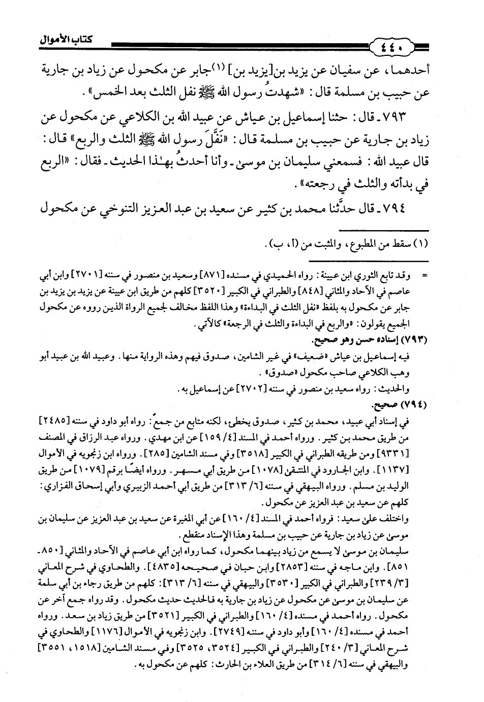 794 - (800) قَالَ: حَدَّثَنَا مُحَمَّدُ بْنُ كَثِيرٍ، عَنْ سَعِيدِ بْنِ عَبْدِ الْعَزِيزِ التَّنُوخِيِّ، عَنْ مَكْحُولٍ، #441# عَنْ زِيَادِ بْنِ جَارِيَةَ، عَنْ حَبِيبِ بْنِ مَسْلَمَةَ، قَالَ: نَفَلَ رَسُولُ اللَّهِ صَلَّى اللهُ عَلَيْهِ وَسَلَّمَ فِي الْبَدْأَةِ الرُّبُعَ وَفِي الرَّجْعَةِ الثُّلُثَ.