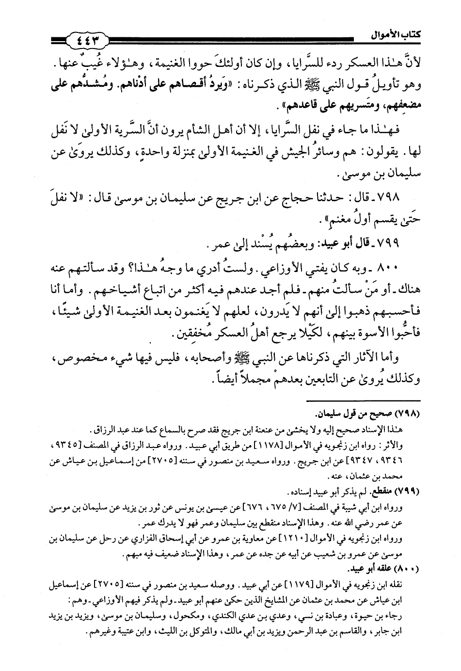 800 - وَبِهِ كَانَ يُفْتِي الْأَوْزَاعِيُّ، وَلَسْتُ أَدْرِي مَا وَجْهُ هَذَا؟ وَقَدْ سَأَلْتُهُمْ عَنْهُ هُنَاكَ - أَوْ مَنْ سَأَلْتُ مِنْهُمْ - فَلَمْ أَجِدْ عِنْدَهُمْ فِيهِ أَكْثَرَ مِنَ اتِّبَاعِ أَشْيَاخِهِمْ، وَأَمَّا أَنَا فَأَحْسَبُهُمْ ذَهَبُوا إِلَى أَنَّهُمْ لَا يَدْرُونَ لَعَلَّهُمْ لَا يَغْنَمُونَ بَعْدَ الْغَنِيمَةِ الْأُولَى شَيْئًا، فَأَحَبُّوا الْأُسْوَةَ بَيْنَهُمْ، لِكَيْلَا يَرْجِعَ أَهْلُ الْعَسْكَرِ مُخْفِقِينَ،