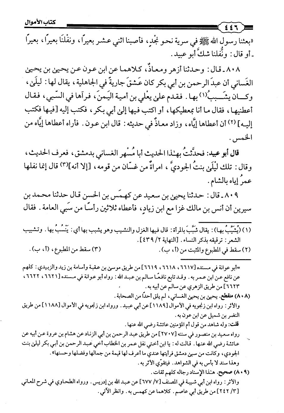 (814) قَالَ أَبُو عُبَيْدٍ: فَحَدَّثْتُ بِهَذَا الْحَدِيثِ أَبَا مُسْهِرٍ الْغَسَّانَيَّ بِدِمَشْقَ، فَعَرَفَ الْحَدِيثَ، وَقَالَ: تِلْكَ لَيْلَى بِنْتُ الْجُودِيِّ، امْرَأَةٌ مِنْ غَسَّانَ مِنْ قَوْمِهِ، إلا أنه قَالَ إِنَّمَا نَفَلَهَا عُمَرُ إِيَّاهُ بِالشَّامِ.