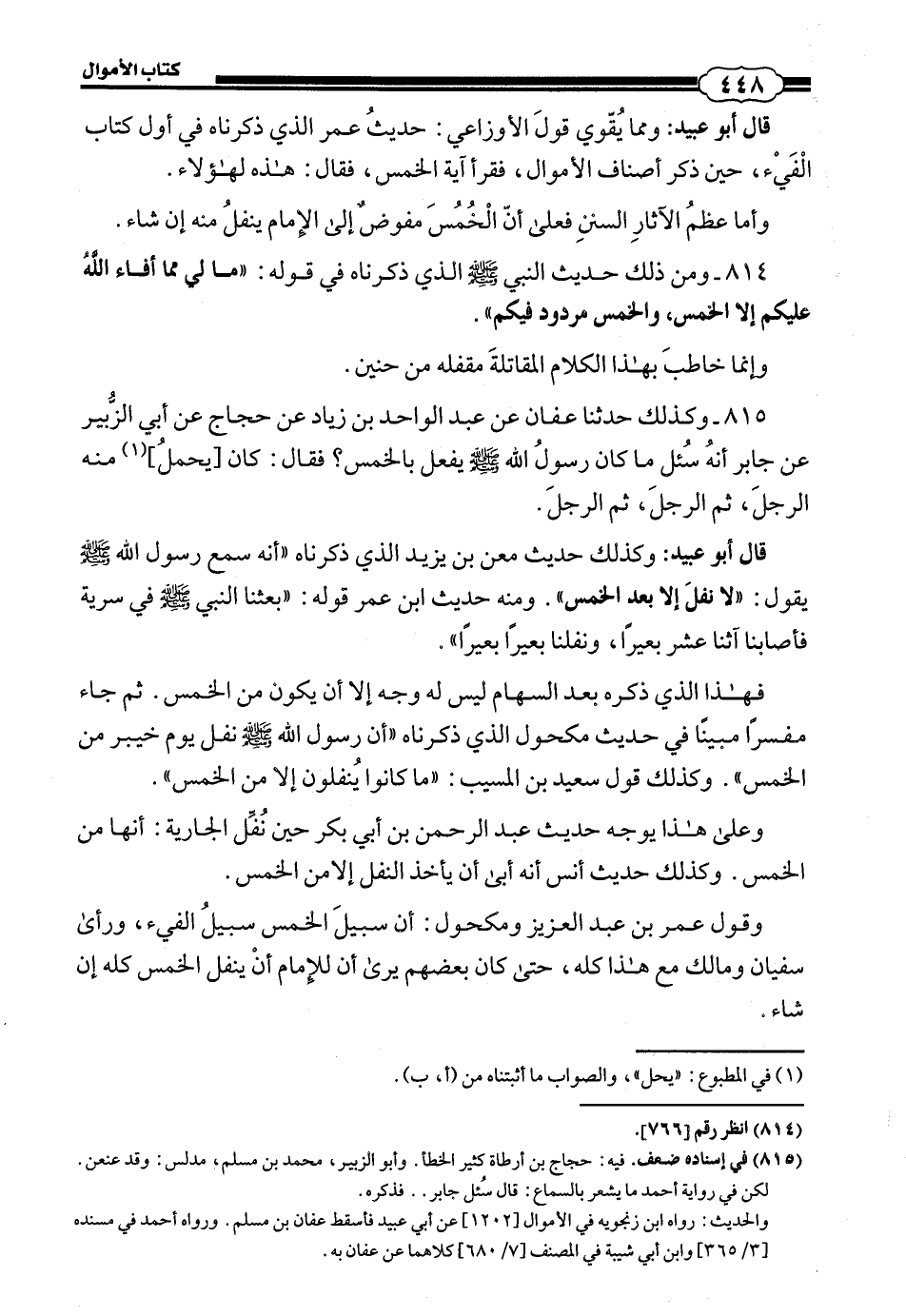 قَالَ أَبُو عُبَيْدٍ: وَكَذَلِكَ حَدِيثُ مَعْنِ بْنِ يَزِيدَ الَّذِي ذَكَرْنَاهُ: أَنَّهُ سَمِعَ رَسُولَ اللَّهِ صَلَّى اللهُ عَلَيْهِ وَسَلَّمَ يَقُولُ: لَا نَفَلَ إِلَّا بَعْدَ الْخُمُسِ وَمِنْهُ حَدِيثُ ابْنِ عُمَرَ قَوْلُهُ: بَعَثَنَا النَّبِيُّ صَلَّى اللهُ عَلَيْهِ وَسَلَّمَ فِي سَرِيَّةٍ فَأَصابنَا اثْنَيْ عَشَرَ بَعِيرًا. ونفلنا بعيرا بعيرا. فَهَذَا [النفلُ] * الَّذِي ذَكَرَهُ بَعْدَ السِّهَامِ لَيْسَ لَهُ وَجْهٌ إِلَّا أَنْ يَكُونَ مِنَ الْخُمُسِ، ثُمَّ جَاءَ مُفَسَّرًا مُبَيَّنًا فِي حَدِيثِ مَكْحُولٍ الَّذِي ذَكَرْنَاهُ: أَنَّ رَسُولَ اللَّهِ صَلَّى اللهُ عَلَيْهِ وَسَلَّمَ نَفَلَ يَوْمَ خَيْبَرَ مِنَ الْخُمُسِ، وَكَذَلِكَ قَوْلُ سَعِيدِ بْنِ الْمُسَيِّبِ: مَا كَانُوا يُنَفِّلُونَ إِلَّا مِنَ الْخُمُسِ، وَعَلَى هَذَا يُوَجَّهُ حَدِيثُ عَبْدِ الرَّحْمَنِ بْنُ أَبِي بَكْرٍ، حِينَ نَفَلَ الْجَارِيَةَ: أَنَّهَا مِنَ الْخُمُسِ، وَكَذَلِكَ حَدِيثُ أَنَسٍ: أَنَّهُ أَبَى أَنْ يَاخُذَ النَّفَلَ إِلَّا مِنَ الْخُمُسِ، وَقَوْلُ عُمَرَ بْنِ عَبْدِ الْعَزِيزِ وَمَكْحُولٍ: أَنَّ سَبِيلَ الْخُمُسِ سَبِيلُ الْفَيْءِ، وَرَايُ سُفْيَانَ وَمَالِكٍ مَعَ هَذَا كُلِّهِ، حَتَّى كَانَ بَعْضُهُمْ يَرَى أَنَّ لِلْإِمَامِ أَنْ يُنَفِّلُ الْخُمُسَ كُلَّهُ إِنْ شَاءَ.