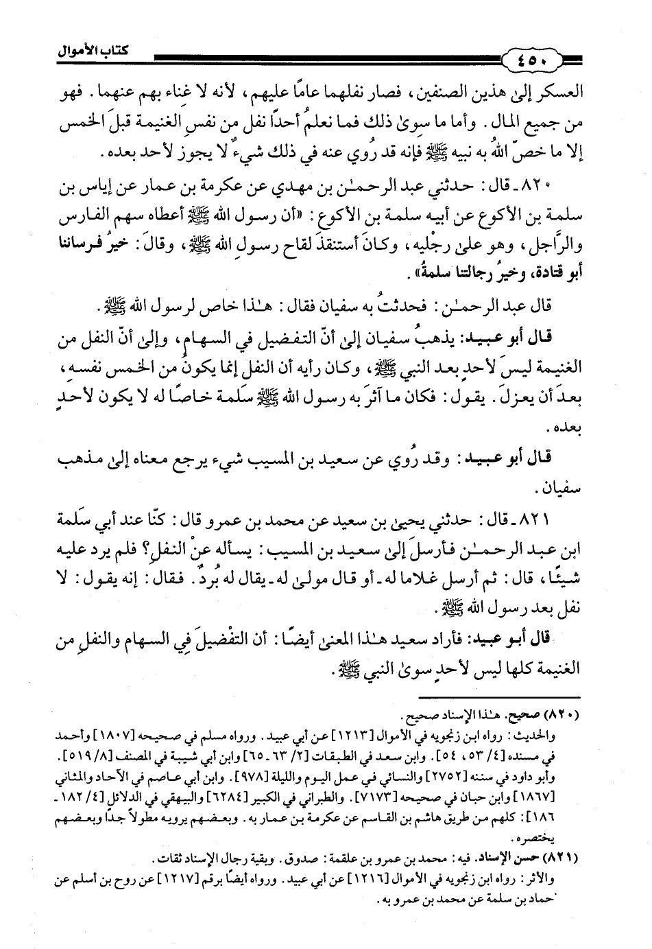 (828) قَالَ عَبْدُ الرَّحْمَنِ: فَحَدَّثْتُ بِهِ سُفْيَانَ، فَقَالَ: هَذَا خَاصٌّ لِرَسُولِ اللَّهِ صَلَّى اللهُ عَلَيْهِ وَسَلَّمَ قَالَ أَبُو عُبَيْدٍ: يَذْهَبُ سُفْيَانُ إِلَى أَنَّ التَّفْضِيلَ فِي السِّهَامِ، وَإِلَى أَنَّ النَّفَلَ مِنَ الْغَنِيمَةِ لَيْسَ لِأَحَدٍ بَعْدَ النَّبِيِّ صَلَّى اللهُ عَلَيْهِ وَسَلَّمَ وَكَانَ رَايُهُ أَنَّ النَّفَلَ إِنَّمَا يَكُونُ مِنَ الْخُمُسِ نَفْسِهِ، بَعْدَ أَنْ يُعْزَلَ، يَقُولُ: فَكَانَ مَا آثَرَ بِهِ رَسُولُ اللَّهِ صَلَّى اللهُ عَلَيْهِ وَسَلَّمَ سَلَمَةَ خَاصًّا لَهُ لَا يَكُونُ لِأَحَدٍ بَعْدَهُ. قَالَ أَبُو عُبَيْدٍ: وَقَدْ رُوِيَ عَنْ سَعِيدِ بْنِ الْمُسَيِّبِ شَيْءٌ يَرْجِعُ مَعْنَاهُ إِلَى مَذْهَبِ سُفْيَانَ.