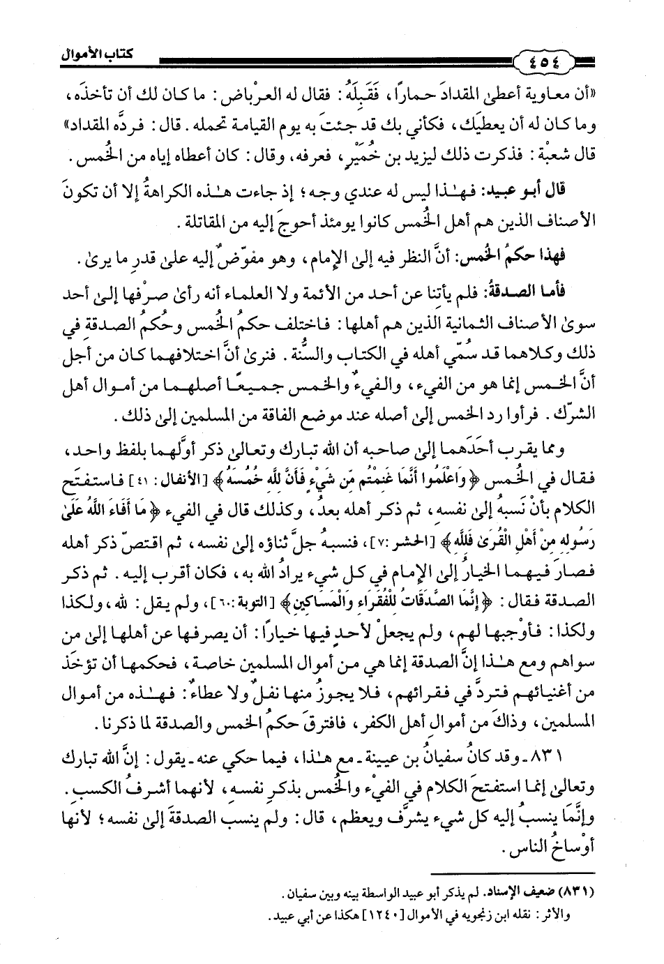 قَالَ أَبُو عُبَيْدٍ: وَلَيْسَ هَذَا بَرَّادٍ لِمَذْهَبِنَا، بَلْ هُوَ يُحَقِّقُهُ؛ لِأَنَّ اللَّهَ تَبَارَكَ وَتَعَالَى قَرَنَ الْفَيْءَ وَالْخُمُسَ فِي مَعْنًى وَاحِدٍ، وَلَمْ يُمَيِّزْ بَيْنَهُمَا، وَأَبَانَ الصَّدَقَةَ مِنْ ذَلِكَ بِمَعْنًى سِوَى هَذَا، فِيمَا نَرَى. وَاللَّهُ أَعْلَمُ.