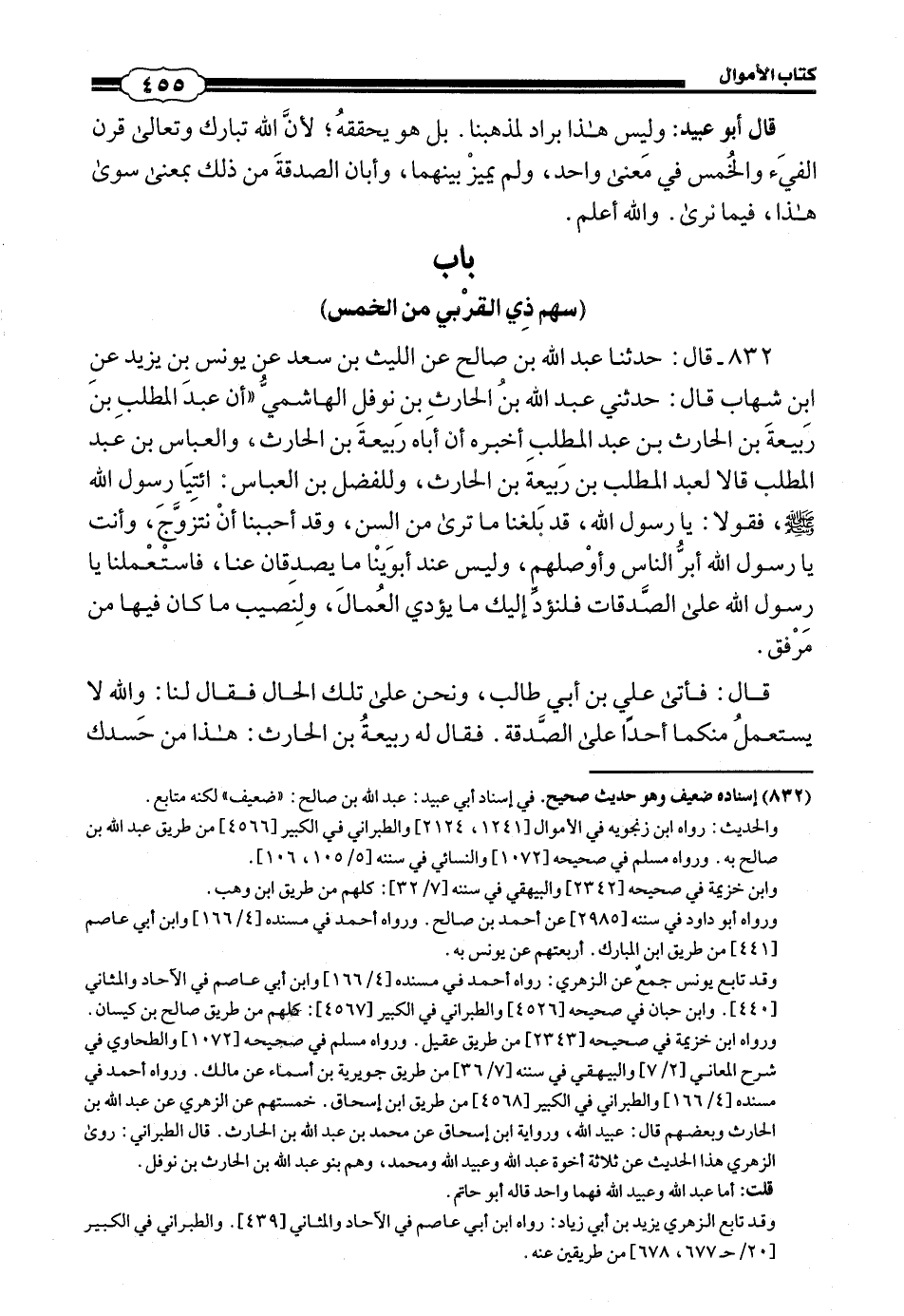 832 - (842) قَالَ: حَدَّثَنَا عَبْدُ اللَّهِ بْنُ صَالِحٍ، عَنِ اللَّيْثِ بْنِ سَعْدٍ، عَنْ يُونُسَ بْنِ يَزِيدَ، عَنْ ابْنِ شِهَابٍ، قَالَ: حَدَّثَنِي عَبْدُ اللَّهِ بْنُ الْحَارِثِ بْنِ نَوْفَلٍ الْهَاشِمِيُّ، أَنَّ عَبْدَ الْمُطَّلِبِ بْنَ رَبِيعَةَ بْنِ الْحَارِثِ بْنِ عَبْدِ الْمُطَّلِبِ أَخْبَرَهُ أَنَّ أَبَاهُ رَبِيعَةَ بْنَ الْحَارِثِ، وَالْعَبَّاسَ بْنَ عَبْدِ الْمُطَّلِبِ، قَالَا لِعَبْدِ الْمُطَّلِبِ بْنِ رَبِيعَةَ بْنِ الْحَارِثِ، وَلِلْفَضْلِ بْنِ الْعَبَّاسِ: ائْتِيَا رَسُولَ اللَّهِ صَلَّى اللهُ عَلَيْهِ وَسَلَّمَ، فَقُولَا: يَا رَسُولَ اللَّهِ، قَدْ بَلَغَنَا مَا تَرَى مِنَ السِّنِّ، وَقَدْ أَحْبَبْنَا أَنْ نَتَزَوَّجَ، وَأَنْتَ يَا رَسُولَ اللَّهِ أَبَرُّ النَّاسِ وَأَوْصَلُهُمْ، وَلَيْسَ عِنْدَ أَبَوَيْنَا مَا يُصْدِقَانِ عَنَّا، فَاسْتَعْمِلْنَا يَا رَسُولَ اللَّهِ عَلَى الصَّدَقَاتِ فلنؤد إِلَيْكَ مَا يُؤَدِّي الْعُمَّالُ، وَلِنُصِيبَ مَا كَانَ فِيهَا مِنْ مَرْفَقٍ. قَالَ: فَأَتَى عَلِيُّ بْنُ أَبِي طَالِبٍ، وَنَحْنُ عَلَى تِلْكَ الْحَالِ، فَقَالَ لَنَا: وَاللَّهِ لَا يَسْتَعْمِلُ مِنْكُمَا أَحَدًا عَلَى الصَّدَقَةِ، فَقَالَ لَهُ رَبِيعَةُ بْنُ الْحَارِثِ: هَذَا مِنْ حَسَدِكَ #456# وَبَغْيِكَ، وَقَدْ نِلْتَ صِهْرَ رَسُولِ اللَّهِ فَلَمْ نَحْسُدْكَ عَلَيْهِ، قَالَ: فَأَلْقَى عَلِيُّ رِدَاءَهُ، ثُمَّ جَلَسَ عَلَيْهِ، فَقَالَ: أَنَا أَبُو حَسَنِ الْقَوْمِ، وَاللَّهِ لَا أَرِيمُ مَقَامِي هَذَا حَتَّى يَرْجِعَ إِلَيْكُمَا ابْنَاكُمَا بِجَوَابِ مَا بَعَثْتُمَا بِهِ إِلَى رَسُولِ اللَّهِ صَلَّى اللهُ عَلَيْهِ وَسَلَّمَ، قَالَ عَبْدُ الْمُطَّلِبِ: فَانْطَلَقْتُ أَنَا وَالْفَضْلُ حَتَّى نُوَافِقَ صَلَاةَ الظُّهْرِ قَدْ قَامَتْ , فَصَلَّيْنَا مَعَ النَّاسِ , ثُمَّ أَسْرَعْتُ أَنَا والفضل إِلَى بَابِ حُجْرَةِ رَسُولِ اللَّهِ صَلَّى اللهُ عَلَيْهِ وَسَلَّمَ وَهُوَ يَوْمَئِذٍ عِنْدَ زَيْنَبَ بِنْتِ جَحْشٍ فَقُمْنَا بِالْبَابِ، حَتَّى أَتَى رَسُولُ اللَّهِ صَلَّى اللهُ عَلَيْهِ وَسَلَّمَ، فَأَخَذَ بِأُذُنِي وَأُذُنِ الْفَضْلِ، وَقَالَ: " أَخْرِجَا مَا تُصَرِّرَانِ، ثُمَّ دَخَلَ، وَأَذِنَ لِي وَلِلْفَضْلِ فَدَخَلْنَا، فَتَوَاكَلْنَا الْكَلَامَ قَلِيلًا، ثُمَّ كَلَّمْتُهُ أَوْ كَلَّمَهُ الْفَضْلُ - شَكَّ فِي ذَلِكَ عَبْدُ اللَّهِ - قَالَ: فَكَلَّمْنَاهُ بِالَّذِي أَمَرَنَا بِهِ أَبَوَانَا، فَسَكَتَ رَسُولُ اللَّهِ صَلَّى اللهُ عَلَيْهِ وَسَلَّمَ سَاعَةً وَرَفَعَ بَصَرَهُ قِبَلَ سَقْفِ الْبَيْتِ، حَتَّى طَالَ عَلَيْنَا وَظَنَنَّا أَنَّهُ لَا يُرْجِعُ إِلَيْنَا شَيْئًا، وَحَتَّى رَأَيْنَا زَيْنَبَ تُلْمِعُ مِنْ وَرَاءِ الْحِجَابِ بِيَدِهَا، تُرِيدُ أَنْ لَا نَعْجَلَ، إِذْ إِنَّ رَسُولَ اللَّهِ صَلَّى اللهُ عَلَيْهِ وَسَلَّمَ فِي أَمْرِنَا، قَالَ: ثُمَّ خَفَضَ رَسُولُ اللَّهِ صَلَّى اللهُ عَلَيْهِ وَسَلَّمَ رَاسَهُ، فَقَالَ لَنَا: «إِنَّ هَذِهِ الصَّدَقَةَ إِنَّمَا هِيَ أَوْسَاخُ النَّاسِ، وَإِنَّهَا لَا تَحِلُّ لِمُحَمَّدٍ وَلَا لِآلِ مُحَمَّدٍ، ادْعُوا لِي نَوْفَلَ بْنَ الْحَارِثِ»، فَدُعِيَ لَهُ نَوْفَلٌ، فَقَالَ: «يَا نَوْفَلُ، أَنْكِحْ عَبْدَ الْمُطَّلِبِ»، قَالَ: فَأَنْكَحَنِي، قَالَ: ثُمَّ قَالَ رَسُولُ اللَّهِ صَلَّى اللهُ عَلَيْهِ وَسَلَّمَ: «ادْعُوا لِي مَحْمِيَةَ بْنَ جَزْءٍ»، فَقَالَ رَسُولُ اللَّهِ صَلَّى اللهُ عَلَيْهِ وَسَلَّمَ لِمَحْمِيَةَ: " أَنْكِحِ الْفَضْلَ، قَالَ: فَأَنْكَحَهُ، ثُمَّ قَالَ رَسُولُ اللَّهِ صَلَّى اللهُ عَلَيْهِ وَسَلَّمَ: «قُمْ فَأَصْدِقْ عَنْهُمَا مِنَ الْخُمُسِ كَذَا وَكَذَا؟» قَالَ: لَمْ يسمه لي عَبْدُ اللَّهِ بْنُ الْحَ