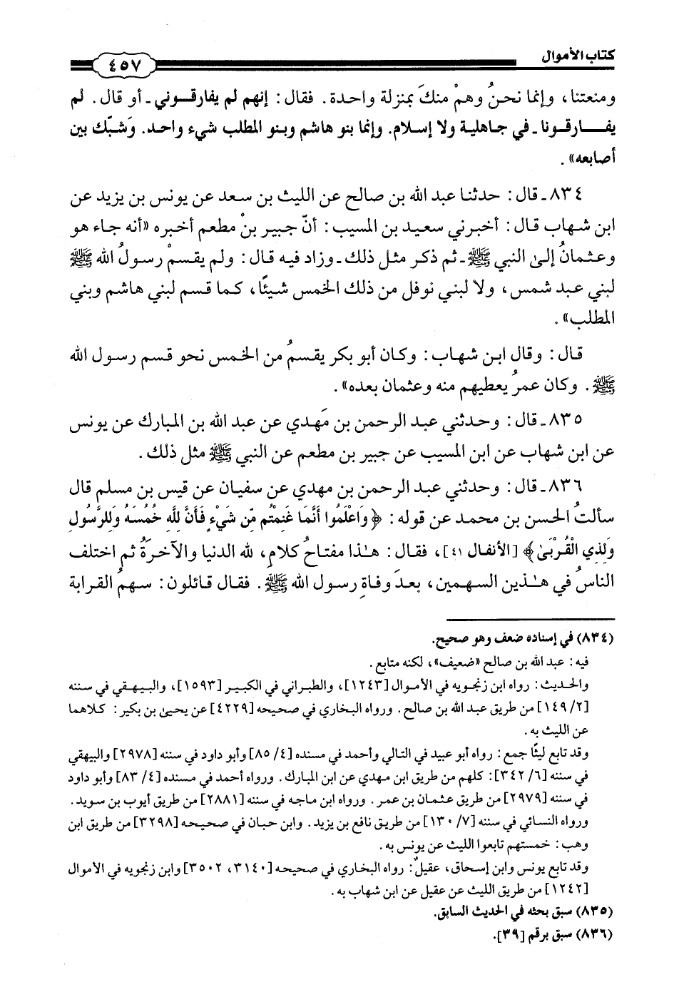 834 - (844) قَالَ: حَدَّثَنَا عَبْدُ اللَّهِ بْنُ صَالِحٍ، عَنِ اللَّيْثِ بْنِ سَعْدٍ، عَنْ يُونُسَ بْنِ يَزِيدَ، عَنِ ابْنِ شِهَابٍ، قَالَ: أَخْبَرَنِي سَعِيدُ بْنُ الْمُسَيِّبِ، أَنَّ جُبَيْرَ بْنَ مُطْعِمٍ أَخْبَرَهُ: أَنَّهُ جَاءَ هُوَ وَعُثْمَانُ إِلَى النَّبِيِّ صَلَّى اللهُ عَلَيْهِ وَسَلَّمَ - ثُمَّ ذَكَرَ مِثْلَ ذَلِكَ وَزَادَ فِيهِ قَالَ: وَلَمْ يَقْسِمْ رَسُولُ اللَّهِ صَلَّى اللهُ عَلَيْهِ وَسَلَّمَ لِبَنِي عَبْدِ شَمْسِِ وِلَا لِبَنِي نَوْفَلٍ مِنْ ذَلِكَ الْخُمُسِ شَيْئًا، كَمَا قَسَمَ لِبَنِي هَاشِمٍ وَبَنِي الْمُطَّلِبِ.