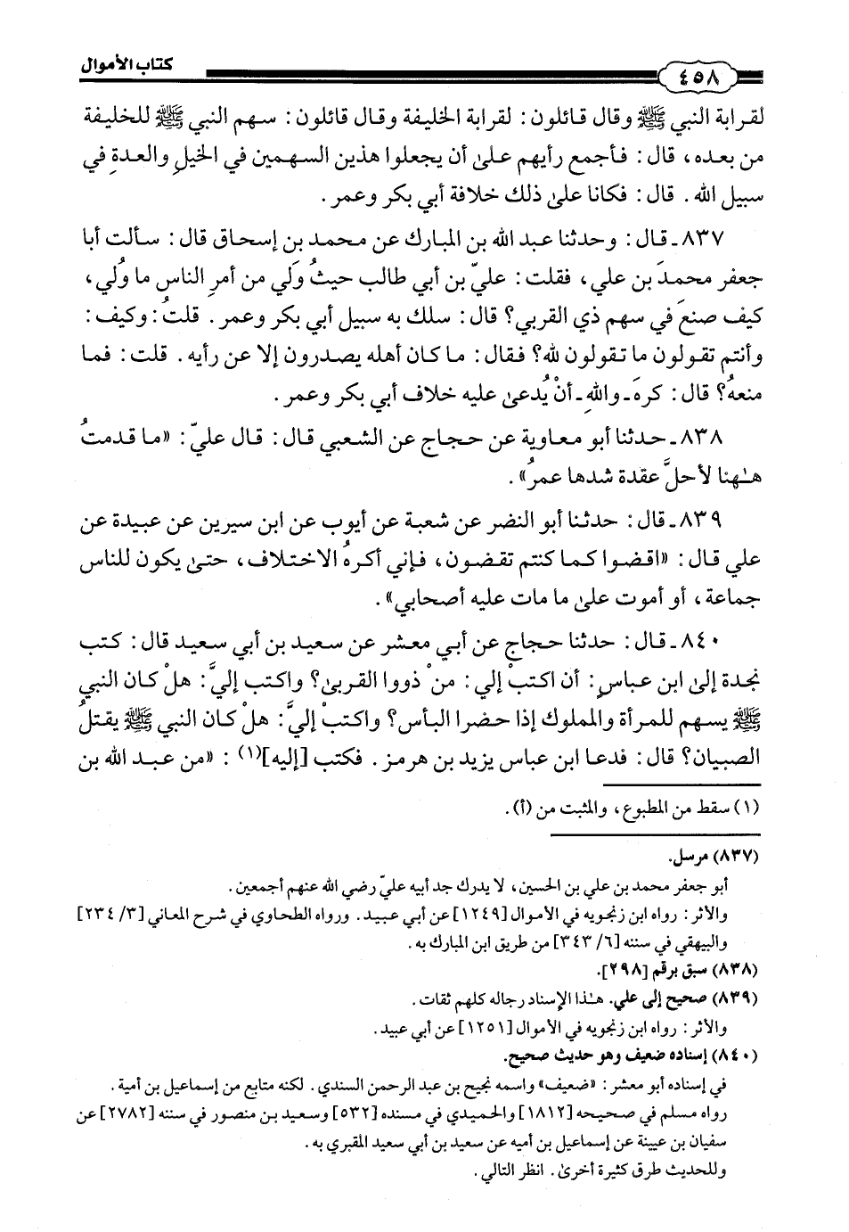 837 - (848) قَالَ: وَحَدَّثَنَا عَبْدُ اللَّهِ بْنُ الْمُبَارَكِ، عَنْ مُحَمَّدِ بْنِ إِسْحَاقَ، قَالَ: سَأَلْتُ أَبَا جَعْفَرٍ مُحَمَّدَ بْنَ عَلِيٍّ، فَقُلْتُ: عَلِيُّ بْنُ أَبِي طَالِبٍ حَيْثُ وَلِيَ مِنْ أَمْرِ النَّاسِ مَا وَلِيَ، كَيْفَ صَنَعَ فِي سَهْمِ ذِي الْقُرْبَى؟ قَالَ: «سَلَكَ بِهِ سَبِيلَ أَبِي بَكْرٍ وَعُمَرَ»، قُلْتُ: وَكَيْفَ: وَأَنْتُمْ تَقُولُونَ مَا تَقُولُونَ لله؟ فَقَالَ: «مَا كَانَ أَهْلُهُ يَصْدُرُونَ إِلَّا عَنْ رَايِهِ»، قُلْتُ: فَمَا مَنَعَهُ؟ قَالَ: «كَرِهَ وَاللَّهِ أَنْ يُدْعَى عَلَيْهِ خِلَافَ أَبِي بَكْرٍ وَعُمَرَ».
