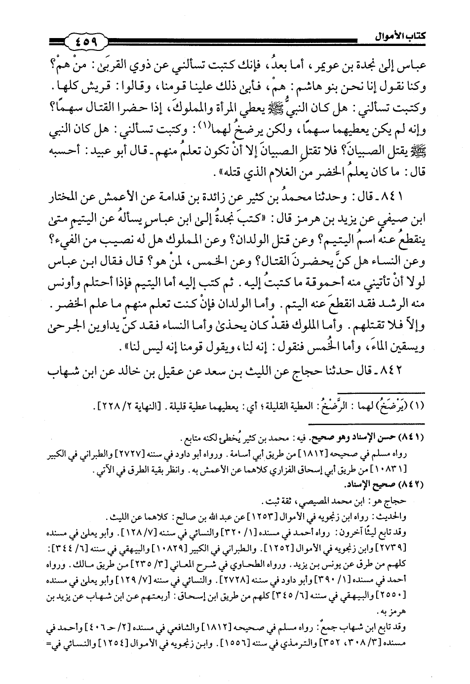 841 - (852) قَالَ: وَحَدَّثَنَا مُحَمَّدُ بْنُ كَثِيرٍ، عَنْ زَائِدَةَ بْنِ قُدَامَةَ، عَنِ الْأَعْمَشِ، عَنِ الْمُخْتَارِ بْنِ صَيْفِيٍّ، عَنْ يَزِيدَ بْنِ هُرْمُزَ، قَالَ: كَتَبَ نَجْدَةُ إِلَى ابْنِ عَبَّاسٍ يَسْأَلُهُ عَنِ الْيَتِيمِ، مَتَى يَنْقَطِعُ عَنْهُ اسْمُ الْيَتِيمِ؟ وَعَنْ قَتْلِ الْوِلْدَانِ؟ وَعَنِ الْمَمْلُوكِ، هَلْ لَهُ نَصِيبٌ مِنَ الْفَيْءَ؟ وَعَنِ النِّسَاءِ، هَلْ كُنَّ يَحْضُرْنَ الْقِتَالَ؟ وَعَنِ الْخُمُسِ، لِمَنْ هُوَ؟ قَالَ: فَقَالَ ابْنُ عَبَّاسٍ: وَلَوْلَا أَنْ تَاتِيَنِي مِنْهُ أُحْمُوقَةٌ مَا كَتَبْتُ إِلَيْهِ، ثُمَّ كَتَبَ إِلَيْهِ: أَمَّا الْيَتِيمُ فَإِذَا احْتَلَمَ وَأُونِسَ مِنْهُ الرُّشْدُ فَقَدِ انْقَطَعَ عَنْهُ الْيُتْمُ، وَأَمَّا الْوِلْدَانُ فَإِنْ كُنْتَ تَعْلَمُ مِنْهُمْ مَا عَلِمَ الْخَضِرُ، وَإِلَّا فَلَا تَقْتُلْهُمْ، وَأَمَّا الْمَمْلُوكُ فَقَدْ كَانَ يُحْذَى، وَأَمَّا النِّسَاءُ فَقَدْ كُنَّ يُدَاوِينَ الْجَرْحَى وَيَسْقِينَ الْمَاءَ، وَأَمَّا الْخُمُسُ فَنَقُولُ: إِنَّهُ لَنَا، وَيَقُولُ قَوْمُنَا: إِنَّهُ لَيْسَ لَنَا.