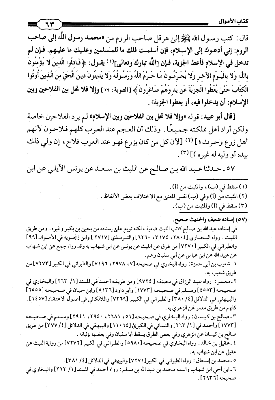 57 - (56) حَدَّثَنَا عَبْدُ اللَّهِ بْنُ صَالِحٍ، عَنِ اللَّيْثِ بْنِ سَعْدٍ، عَنْ يُونُسَ الْآيليِّ، عَنْ #64# ابْنِ شِهَابٍ، عَنْ عُبَيْدِ اللَّهِ بْنِ عَبْدِ اللَّهِ، أَنَّ ابْنَ عَبَّاسٍ، أَخْبَرَهُ أَنَّ أَبَا سُفْيَانَ بْنِ حَرْبٍ أَخْبَرَهُ أَنَّ هِرَقْلَ أَرْسَلَ إِلَيْهِ فِي رَكْبٍ مِنْ قُرَيْشٍ، وَكَانُوا تُجَّارًا بِالشَّامِ، فِي الْمُدَّةِ الَّتِي مَادَّ فِيهَا رَسُولُ اللَّهِ صَلَّى اللهُ عَلَيْهِ وَسَلَّمَ أَبَا سُفْيَانَ وَكُفَّارَ قُرَيْشٍ فَأَتَوْهُ بِإِيلِيَاءَ، فَسَأَلَهُمْ عَنِ النَّبِيِّ صَلَّى اللهُ عَلَيْهِ وَسَلَّمَ فِي حَدِيثٍ طَوِيلٍ قَالَ: ثُمَّ دَعَا بِكِتَابِ رَسُولِ اللَّهِ صَلَّى اللهُ عَلَيْهِ وَسَلَّمَ الَّذِي بَعَثَ بِهِ مَعَ دِحْيَةَ الْكَلْبِيِّ إِلَى عَظِيمِ بُصْرَى إِلَى هِرَقْلَ فَإِذَا فِيهِ: " بِسْمِ اللَّهِ الرَّحْمَنِ الرَّحِيمِ، مِنْ مُحَمَّدٍ رَسُولِ اللَّهِ إِلَى هِرَقْلَ عَظِيمِ الرُّومِ، السَّلَامُ عَلَى مَنِ اتَّبَعَ الْهُدَى، أَمَّا بَعْدُ، فَإِنِّي أَدْعُوكَ بِدِعَايَةِ الْإِسْلَامِ، أَسْلِمْ تَسْلَمْ واسلم يُؤْتِكَ اللَّهُ أَجْرَكَ مَرَّتَيْنٍ، فَإِنْ تَوَلَّيْتَ فَإِنَّ عَلَيْكَ إِثْمَ الْأَرِيسِيِّينَ: {قُلْ يَا أَهْلَ الْكِتَابِ تَعَالَوْا إِلَى كَلِمَةٍ سَوَاءٍ بَيْنَنَا وَبَيْنَكُمْ أَلَّا نَعْبُدَ إِلَّا اللَّهَ وَلَا نُشْرِكَ بِهِ شَيْئًا وَلَا يَتَّخِذَ بَعْضُنَا بَعْضًا أَرْبَابًا مِنْ دُونِ اللَّهِ، فَإِنْ تَوَلَّوْا فَقُولُوا اشْهَدُوا بِأَنَّا مُسْلِمُونَ} [آل عمران: 64] ".