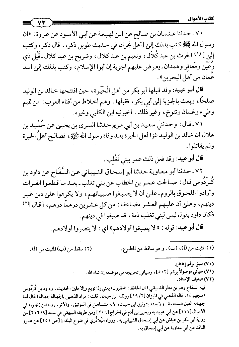 72 - (70) حَدَّثَنَا أَبُو مُعَاوِيَةَ، حَدَّثَنَا أَبُو إِسْحَاقَ الشَّيْبَانِيُّ، عَنِ السَّفَّاحِ، عَنْ دَاوُدَ بْنِ كُرْدُوسٍ، قَالَ: «صَالَحْتُ عُمَرَ بْنَ الْخَطَّابِ عَنْ بَنِي تَغْلِبَ، بَعْدَمَا قَطَعُوا الْفُرَاتَ وَأَرَادُوا اللُّحُوقَ بِالرُّومِ، عَلَى أَنْ لَا يَصْبِغُوا صِبْيَانَهُمْ، وَلَا يُكْرَهُوا عَلَى دِينٍ غَيْرِ دِينِهِمْ، وَعَلَى أَنَّ عَلَيْهِمُ الْعُشْرَ مُضَاعَفًا مِنْ كُلِّ عِشْرِينَ دِرْهَمًا دِرْهَمٌ»، قَالَ: فَكَانَ دَاوُدُ يَقُولُ: «لَيْسَ لِبَنِي تَغْلِبَ ذِمَّةٌ، قَدْ صَبَغُوا فِي دِينِهِمْ».