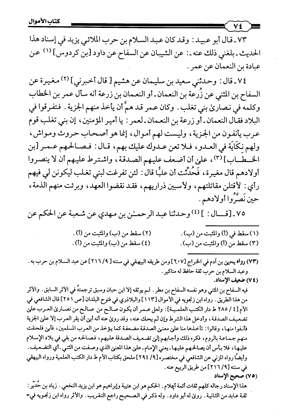 74 - (71) قَالَ وَحَدَّثَنِي سَعِيدُ بْنُ سُلَيْمَانَ، عَنْ هُشَيْمٍ، قَالَ: أَخْبَرَنِي مُغِيرَةُ، عَنِ السَّفَّاحِ بْنِ الْمُثَنَّى، عَنْ زُرْعَةَ بْنِ النُّعْمَانِ أَوِ النُّعْمَانِ بْنِ زُرْعَةَ أَنَّهُ سَأَلَ عُمَرَ بْنَ الْخَطَّابِ وَكَلَّمَهُ فِي نَصَارَى بَنِي تَغْلِبَ، وَكَانَ عُمَرُ قَدْ هَمَّ أَنْ يَاخُذَ مِنْهُمُ الْجِزْيَةَ فَتَفَرَّقُوا فِي الْبِلَادِ، فَقَالَ النُّعْمَانُ أَوْ زُرْعَةُ بْنُ النُّعْمَانِ لِعُمَرَ: يَا أَمِيرَ الْمُؤْمِنِينَ، إِنَّ بَنِي تَغْلِبَ قَوْمٌ عَرَبٌ، يَانَفُونَ مِنَ الْجِزْيَةِ، وَلَيْسَتْ لَهُمْ أَمْوَالٌ، إِنَّمَا هُمْ أَصْحَابُ حُرُوثٍ وَمَوَاشٍ، وَلَهُمْ نِكَايَةً فِي الْعَدُوِّ، فَلَا تُعِنْ عَدُوَّكَ عَلَيْكَ بِهِمْ، قَالَ: «فَصَالَحَهُمْ عُمَرُ بْنُ الْخَطَّابِ، عَلَى أَنْ أَضْعَفَ عَلَيْهِمُ الصَّدَقَةَ، وَاشْتَرَطَ عَلَيْهِمْ أَنْ لَا يُنَصِّرُوا أَوْلَادَهُمْ»