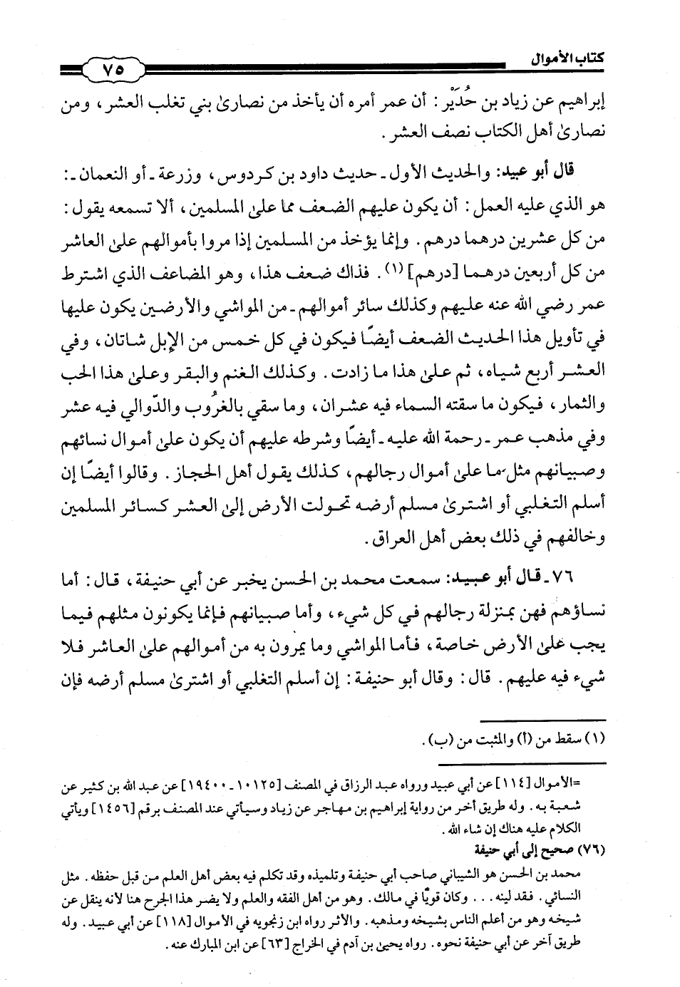 76 - قَالَ أَبُو عُبَيْدٍ: سَمِعْتُ مُحَمَّدَ بْنَ الْحَسَنِ يُخْبِرُ عَنْ أَبِي حَنِيفَةَ، قَالَ: أَمَّا نِسَاؤُهُمْ فَهُنَّ بِمَنْزِلَةِ رِجَالِهِمْ فِي كُلِّ شَيْءٍ، وَأَمَّا صِبْيَانُهُمْ فَإِنَّمَا يَكُونُونَ مَثَلَهُمْ فِيمَا يَجِبُ عَلَى الْأَرْضِ خَاصَّةً، فَأَمَّا الْمَوَاشِي وَمَا يَمُرُّونَ بِهِ مِنْ أَمْوَالِهِمْ عَلَى الْعَاشِرِ فَلَا شَيْءَ فِيهِ عَلَيْهِمْ، قَالَ: وَقَالَ أَبُو حَنِيفَةَ: إِنْ أَسْلَمَ التَّغْلِبِيُّ أَوِ اشْتَرَى مُسْلِمٌ أَرْضَهُ فَإِنَّ #76# الْعُشْرَ عَلَيْهِ مُضَاعَفا عَلَى الْحَالِ الْأُولَى.
