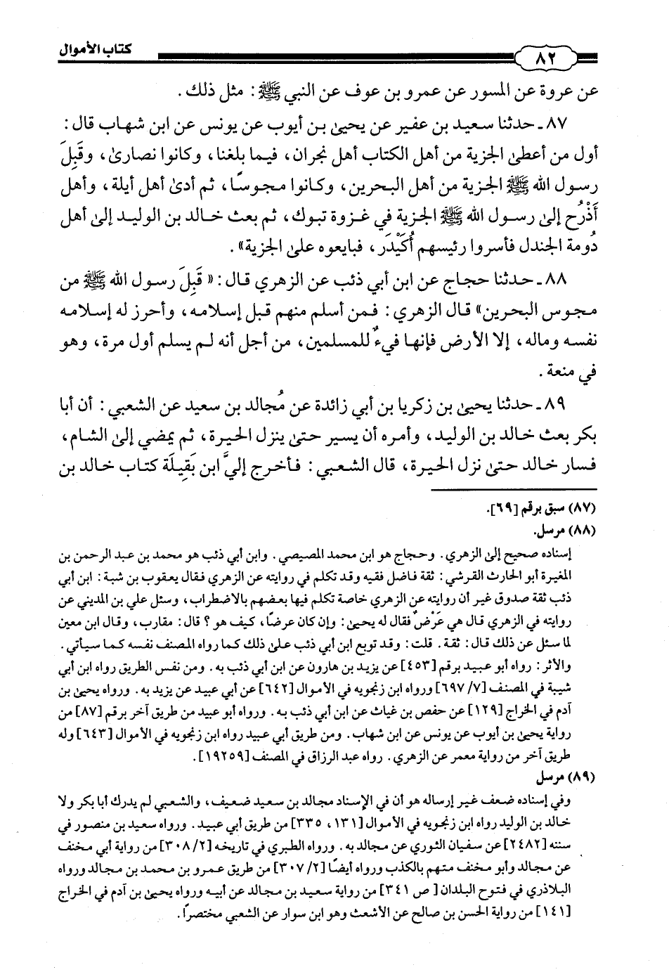 88 - (85) حَدَّثَنَا حَجَّاجٌ، عَنِ ابْنِ أَبِي ذِئْبٍ، عَنِ الزُّهْرِيِّ، قَالَ: قَبِلَ رَسُولُ اللَّهِ صَلَّى اللهُ عَلَيْهِ وَسَلَّمَ مِنْ مَجُوسِ الْبَحْرَيْنِ، قَالَ الزُّهْرِيُّ: فَمَنْ أَسْلَمَ مِنْهُمْ قَبِلَ إِسْلَامَهُ، وَأَحْرَزَ لَهُ إِسْلَامُهُ نَفْسَهُ وَمَالَهُ، إِلَّا الْأَرْضَ فَإِنَّهَا فَيْءٌ لِلْمُسْلِمِينَ، مِنْ أَجْلِ أَنَّهُ لَمْ يُسْلِمْ أَوَّلَ مَرَّةٍ، وَهُوَ فِي مَنَعَةٍ.
