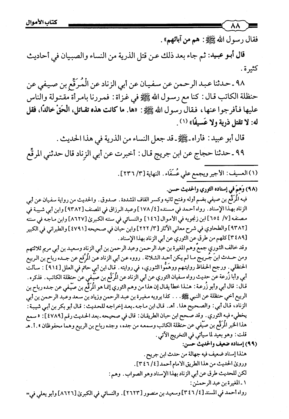 98 - (95) حَدَّثَنَا عَبْدُ الرَّحْمَنِ، عَنْ سُفْيَانَ، عَنْ أَبِي الزِّنَادِ، عَنِ الْمُرَقَّعِ بْنِ صَيْفِيٍّ، عَنْ حَنْظَلَةَ الْكَاتِبِ، قَالَ: كُنَّا مَعَ رَسُولِ اللَّهِ صَلَّى اللهُ عَلَيْهِ وَسَلَّمَ فِي غَزَاةٍ: فَمَرَرْنَا بِامْرَأَةٍ مَقْتُولَةٍ وَالنَّاسُ عَلَيْهَا، فَأَفْرَجُوا عَنْهَا، فَقَالَ رَسُولُ اللَّهِ صَلَّى اللهُ عَلَيْهِ وَسَلَّمَ: " هَا، مَا كَانَتْ هَذِهِ تُقَاتِلُ، الْحَقْ خَالِدًا، فَقُلْ لَهُ: «لَا تَقْتُلْ ذُرِّيَّةً وَلَا عَسِيفًا».