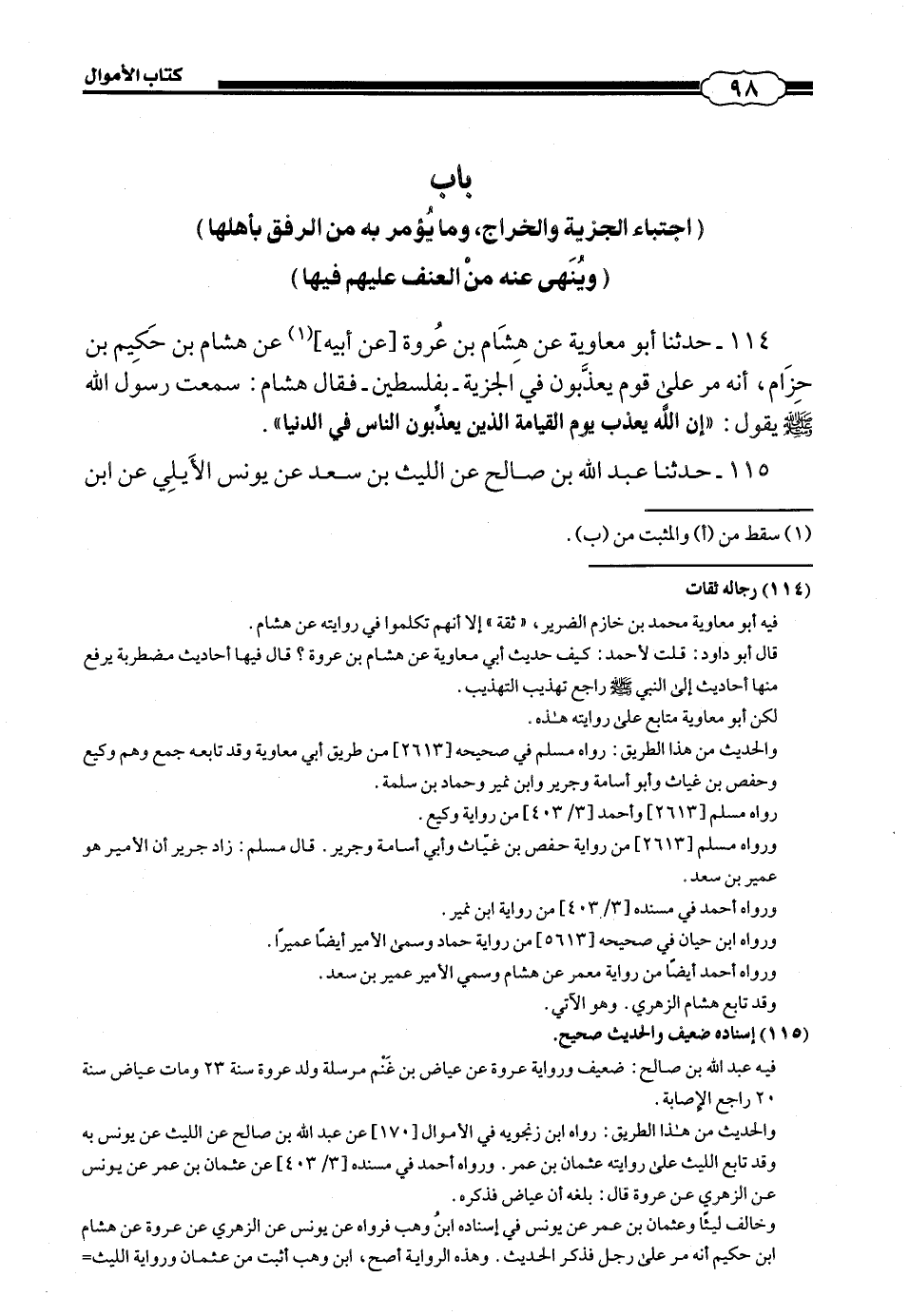 114 - (110) حَدَّثَنَا أَبُو مُعَاوِيَةَ، عَنْ هِشَامِ بْنِ عُرْوَةَ، عَنْ أَبِيهِ، عَنْ هِشَامِ بْنِ حَكِيمِ بْنِ حِزَامٍ، أَنَّهُ مَرَّ عَلَى قَوْمٍ يُعَذَّبُونَ فِي الْجِزْيَةِ بِفِلَسْطِينَ فَقَالَ هِشَامٌ: سَمِعْتُ رَسُولَ اللَّهِ صَلَّى اللهُ عَلَيْهِ وَسَلَّمَ يَقُولُ: «إِنَّ اللَّهَ يُعَذِّبُ يَوْمَ الْقِيَامَةِ الَّذِينَ يُعَذِّبُونَ النَّاسَ فِي الدُّنْيَا».