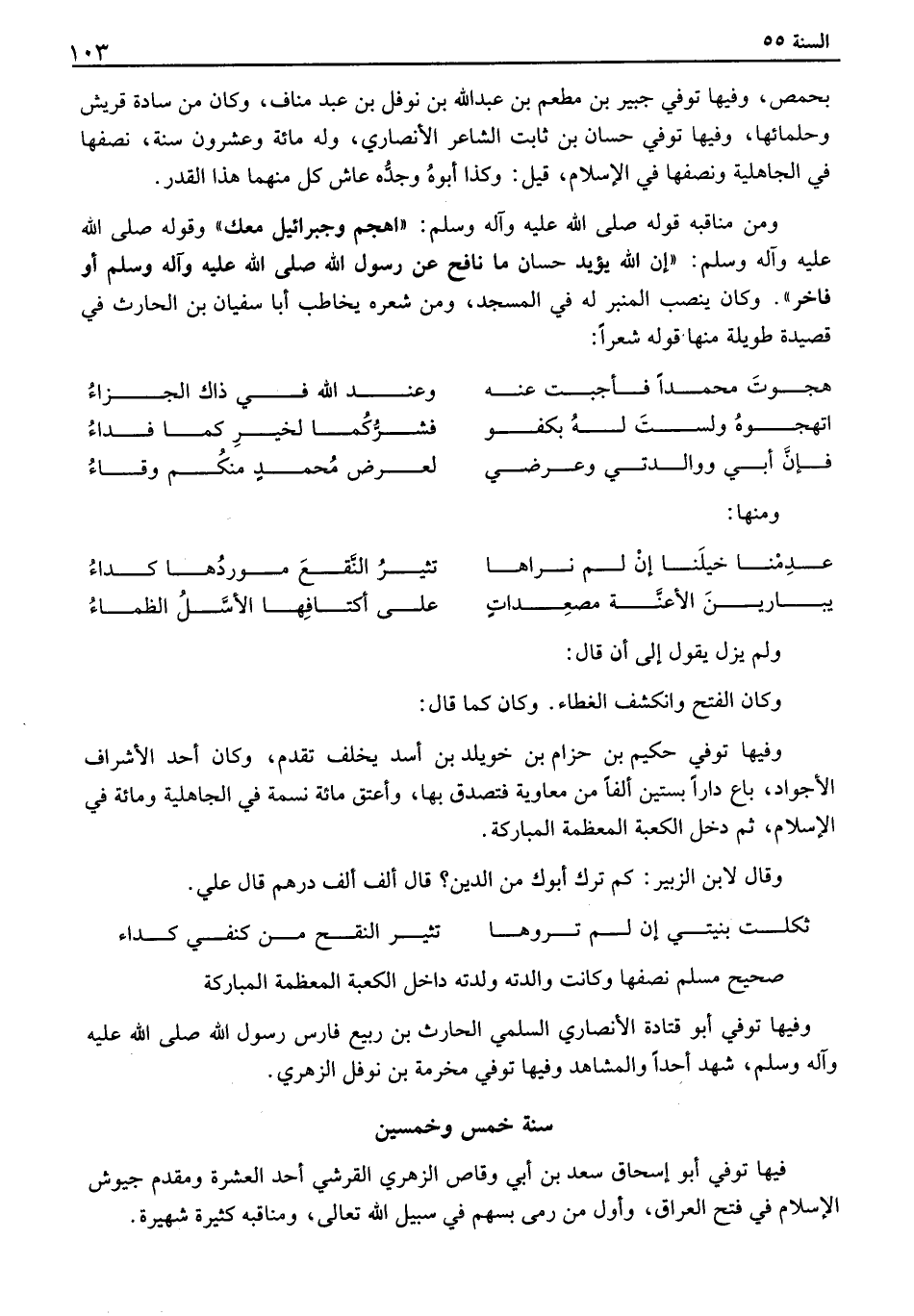 بحمص، وفيها توفي جبير بن مطعم بن عبد الله بن نوفل بن عبد مناف، وكان من سادة قريش وحلمائها، فيها توفي حسان بن ثابت الشاعر الأنصاري، وله مائة وعشرون سنة، نصفها في الجاهلية ونصفها في الإسلام، قيل: وكذا أبوه وجده عاش كل منهما هذا القدر. ومن مناقبه قوله صلى الله عليه وآله وسلم: " اهجم وجبرائيل معك " وقوله صلى الله عليه وآله وسلم: " إن الله يؤيد حسان ما نافح عن رسول الله صلى الله عليه وآله وسلم أو فاخر ". وكان ينصب المنبر له في المسجد، ومن شعره يخاطب أبا سفيان بن الحارث في قصيدة طويلة منها قوله شعراً: