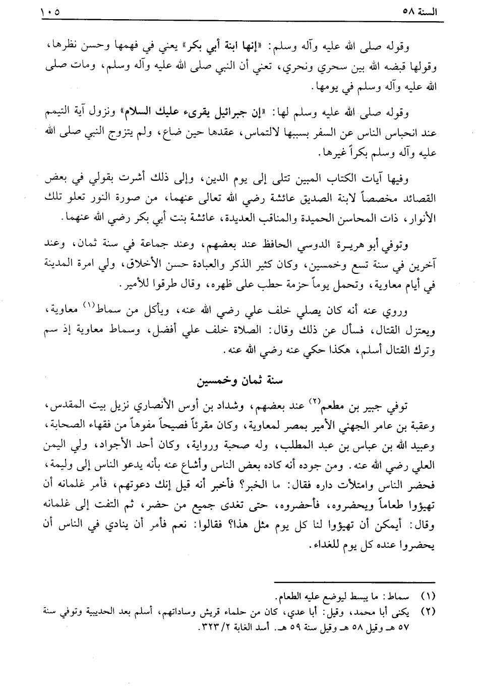 وقوله صلى الله عليه وآله وسلم: " إنها ابنة أبي بكر " يعني في فهمها وحسن نظرها، وقولها قبضه الله بين سحري ونحري، تعني أن النبي صلى الله عليه وآله وسلم، ومات صلى الله عليه وآله وسلم في يومها. وقوله صلى الله عليه وسلم لها: " إن جبرائيل يقرىء عليك السلام " ونزول آية التيمم عند انحباس الناس عن السفر بسببها لالتماس، عقدها حين ضاع، ولم يتزوج النبي صلى الله عليه وآله وسلم بكراً غيرها. وفيها آيات الكتاب المبين تتلى إلى يوم الدين، وإلى ذلك أشرت بقولي في بعض القصائد مخصصاً لابنة الصديق عائشة رضي الله تعالى عنهما، من صورة النور تعلو تلك الأنوار، ذات المحاسن الحميدة والمناقب العديدة، عائشة بنت أبي بكر رضي الله عنهما. وتوفي أبو هريرة الدوسي الحافظ عند بعضهم، وعند جماعة في سنة ثمان، وعند آخرين في سنة تسع وخمسين، وكان كثير الذكر والعبادة حسن الأخلاق، ولي امرة المدينة في أيام معاوية، وتحمل يوماً حزمة حطب على ظهره، وقال طرقوا للأمير. وروي عنه أنه كان يصلي خلف علي رضي الله عنه، ويأكل من سماط معاوية ويعتزل القتال، فسأل عن ذلك وقال: الصلاة خلف علي أفضل، وسماط معاوية إذ سم وترك القتال أسلم، هكذا حكي عنه رضي الله عنه.