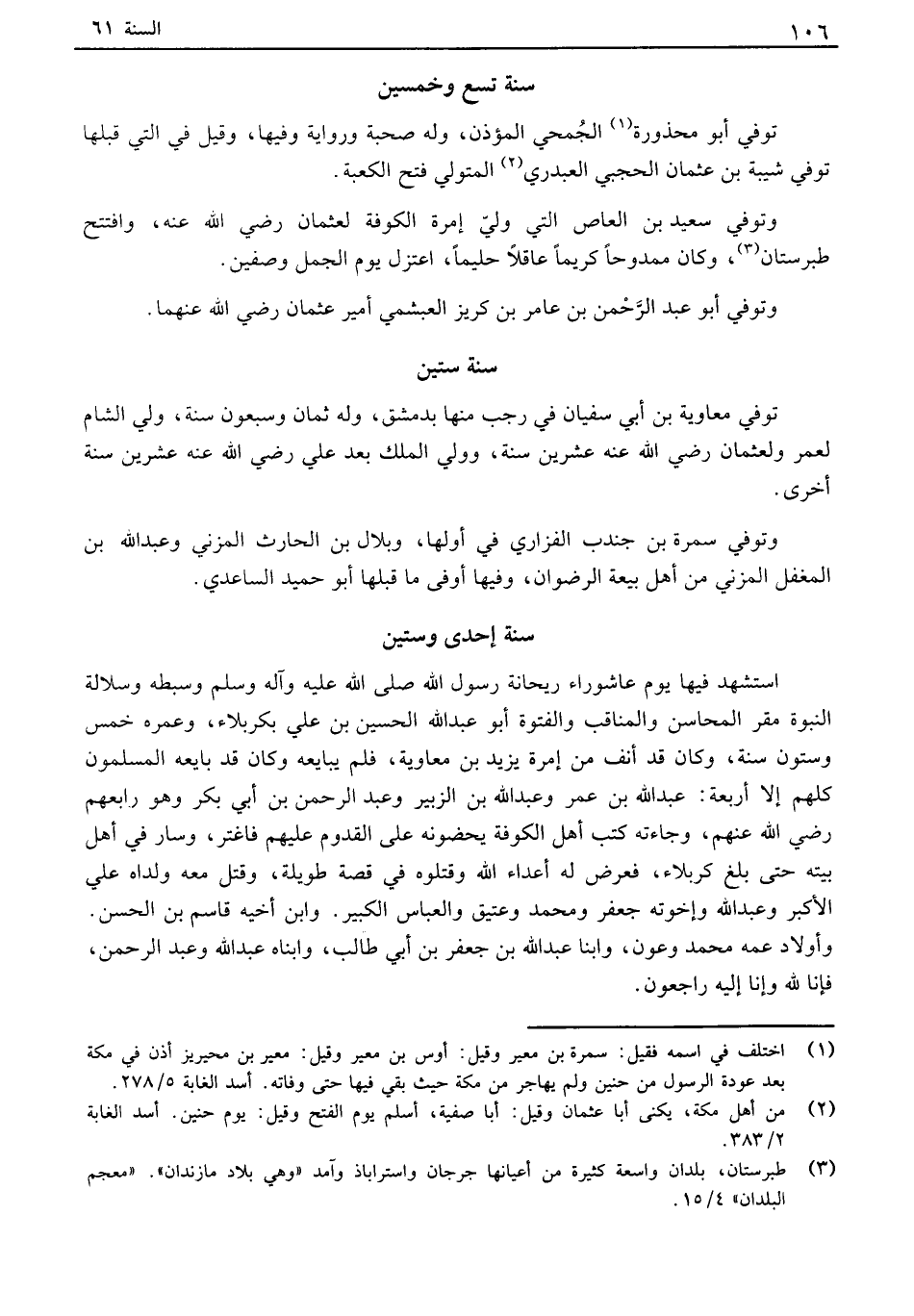 استشهد فيها يوم عاشوراء ريحانة رسول الله صلى الله عليه وآله وسلم وسبطه وسلالة النبوة مقر المحاسن والمناقب والفتوة أبو عبد الله الحسين بن علي بكربلاء، عمره خمس وستون سنة، وكان قد أنف من إمرة يزيد بن معاوية، فلم يبايعه وكان قد بايعه المسلمون كلهم إلا أربعة: عبد الله بن عمر وعبد الله بن الزبير وعبد الرحمن بن أبي بكر وهو رابعهم رضي الله عنهم، وجاءته كتب أهل الكوفة يحضونه على القدوم عليهم فاغتر، وسار في أهل بيته حتى بلغ كربلاء، فعرض له أعداء الله وقتلوه في قصة طويلة، وقتل معه ولداه علي الأكبر وعبد الله وإخوته جعفر ومحمد وعتيق والعباس الكبير. وابن أخيه قاسم بن الحسن. وأولاد عمه محمد وعون، وابنا عبد الله بن جعفر بن أبي طالب، وابناه عبد الله وعبد الرحمن، فإنا لله وإنا إليه راجعون.