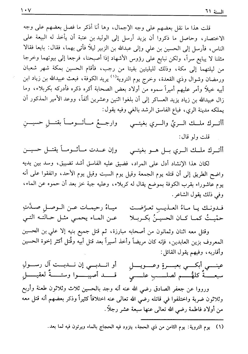 قلت هذا ما نقل بعضهم على وجه الإجمال، وها أنا أذكر ما فصل بعضهم على وجه الاختصار، وحاصل ما ذكروا أن يزيد أرسل إلى الوليد بن عتبة أن يأخذ له البيعة على الناس، فأرسل إلى الحسين بن علي وإلى عبد الله بن الزبير ليلاً فأتى بهما، فقال: بايعا فقالا مثلنا لا يبايع سراً، ولكن نبايع على رؤوس الأشهاد إذا أصبحنا، فرجعا إلى بيوتهما وخرجا من ليلتهما إلى مكة، وذلك لليليتين بقيتا من رجب، فأقام الحسين بمكة شهر شعبان ورمضان وشوال وفي القعدة، وخرج يوم التروية يريد الكوفة، فبعث عبيد الله بن زياد ابن أبيه خيلاً وأمرعليهم أميراً سموه من أولاد بعض الصحابة أكره ذكره فأدركه بكربلاء، وما زال عبيد الله بن زياد يزيد العساكر إلى أن بلغوا اثنين وعشرين الفاً، ووعد الأمير المذكور أن يملكه مدينة الري، فباع الفاسق الرشد بالغي وفيه يقول: