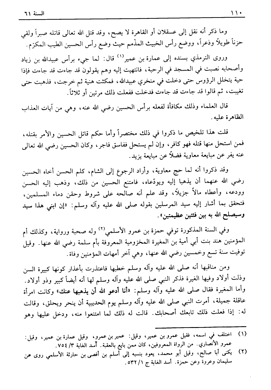 وما ذكر أنه نقل إلى عسقلان أو القاهرة لا يصح، وقد قتل الله تعالى قاتله صبرأ ولقي حزناً طويلاً وذعراً، ووضع رأس الخبيث المذمم حيث وضع رأس الحسين الطيب المكرم. وروى الترمذي بسنده إلى عمارة بن عمير قال: لما جيء برأس عبيد الله بن زياد وأصحابه نصبت في المسجد في الرحبة، فانتهيت إليه وهم يقولون قد جاءت قد جاءت فإذا حية يتخلل الرؤوس حتى دخلت في منخري عبيد الله، فمكثت هنية ثم خرجت، فذهبت حتى تغيبت، ثم قالوا قد جاءت قد جاءت فدخلت ففعلت ذلك مرتين أو ثلاثاً. قال العلماء وذلك مكإفأة لفعله برأس الحسين رضي الله عنه، وهي من آيات العذاب الظاهرة عليه. قلت هذا تلخيص ما ذكروا في ذلك مختصرأ وأما حكم قاتل الحسين والأمر بقتله، فمن استحل منها قتله فهو كافر، وإن لم يستحل ففاسق فاجر، وكان الحسين رضي الله تعالى عنه يفرعن مبايعة معاوية فضلاً عن مبايعة يزيد. وقد ذكروا أنه لما حج معاوية، وأراد الرجوع إلى الشام، كلم الحسن أخاه الحسين رضي الله عنهما أن يذهبا إليه ويودعاه، فامتنع الحسين من ذلك، وذهب إليه الحسن وودعه، وأعطاه مالاً جزيلاً، وقد علم أنه صالحه على شروط وحقن دماء المسلمين، فتحقق بما أشار إليه سيد المرسلين بقوله صلى الله عليه وآله وسلم: " إن ابني هذا سيد وسيصلح الله به بين فئتين عظيمتين ". وفي السنة المذكورة توفي حمزة بن عمرو الأسلمي وله صحبة ورواية، وكذلك أم المؤمنين هند بنت أبي أمية بن المغيرة المخزومية المعروفة بأم سلمة رضي الله عنها. وقيل توفيت سنة تسع وخمسين رضي الله عنها، وهي آخر أمهات المؤمنين وفاة. ومن مناقبها أنه صلى الله عليه وآله وسلم خطبها فاعتذرت بأعذار كونها كبيرة السن وذلت أولاد وفيها الغيرة فذكر النبي صلى الله عليه وآله وسلم لها أنه أيضاً كبير وذو أولاد. وأما المغيرة فقال صلى الله عليه وآله وسلم: " أنا أدعو الله أن يذهبها عنك " وكانت امرأة عاقلة جميلة، امرت النبي صلى الله عليه وآله وسلم يوم الحديبية أن ينحر ويحلق، وقالت له: اذا فعلت ذلك تابعك أصحابك. قالت له ذاك لما امتنعوا منه، ودخل عليها وهو