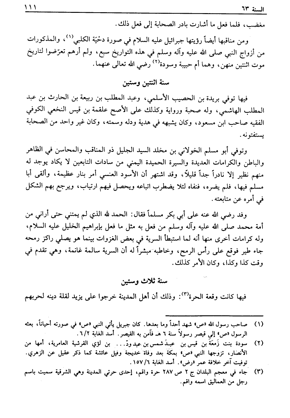 ومن مناقبها أيضاً رؤيتها جبرائيل عليه السلام في صورة دحية الكلبي، المذكورات من أزواج النبي صلى الله عليه وآله وسلم في هذه التواريخ سبع، ولم أرهم تعرضوا لتاريخ موت اثنين منهن، وهما أم حبيبة وسودة رضي الله تعالى عنهما.