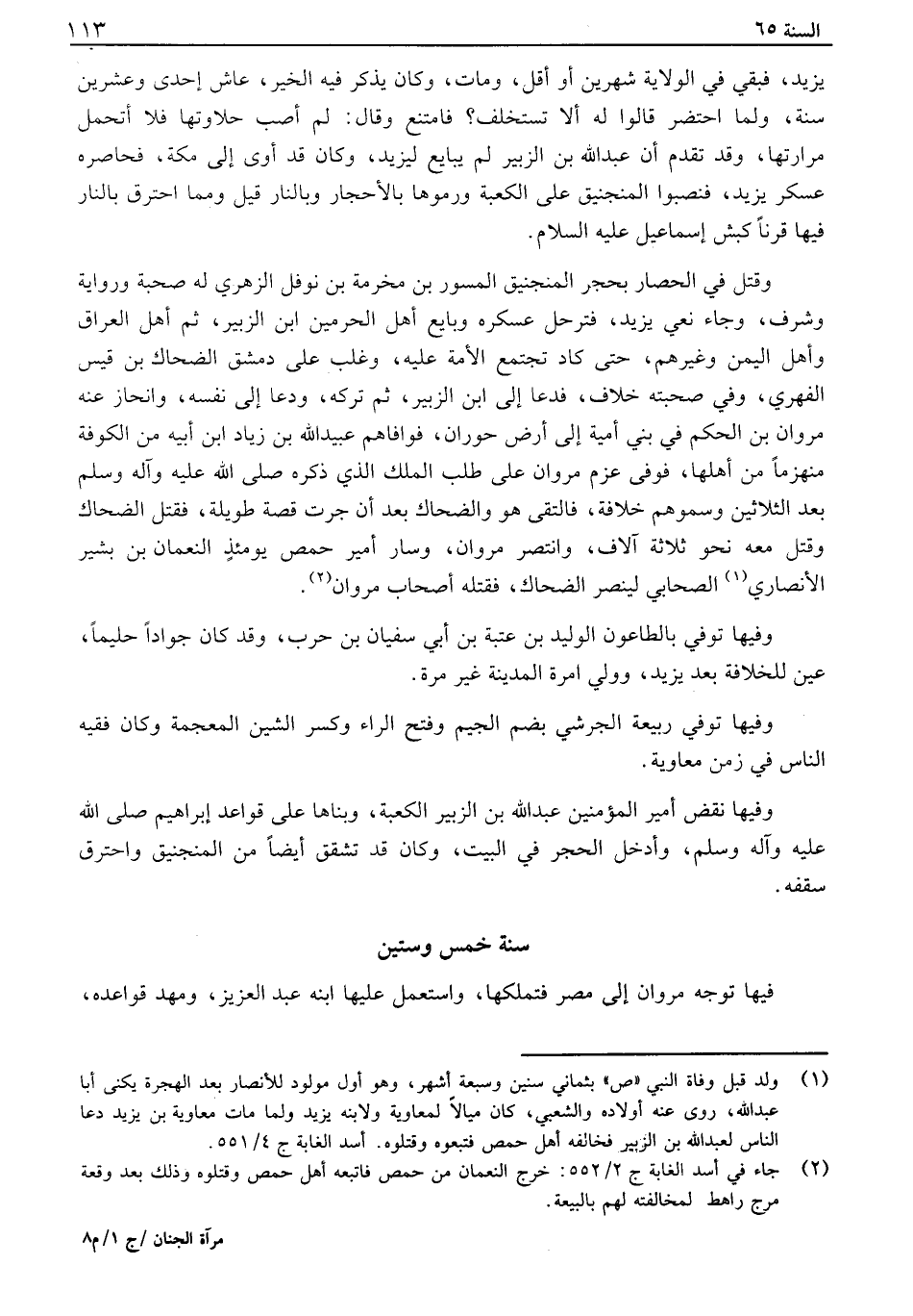 يزيد، فبقي في الولاية شهرين آو أقل، ومات، وكان يذكر فيه الخير، عاش إحدى وعشرين سنة، ولما احتضر قالوا له ألا تستخلف؟ فامتنع وقال: لم أصب حلاوتها فلا أتحمل مرارتها، وقد تقدم أن عبد الله بن الزبير لم يبايع ليزيد، وكان قد آوى إلى مكة، فحاصره عسكر يزيد، فنصبوا المنجنيق على الكعبة ورموها بالأحجار وبالنار قيل ومما احترق بالنار فيها قرناً كبش إسماعيل عليه السلام. وقتل في الحصار بحجر المنجنيق المسور بن مخرمة بن نوفل الزهري له صحبة ورواية وشرف، وجاء نعي يزيد، فترحل عسكره وبايع أهل الحرمين ابن الزبير، ثم أهل العراق وأهل اليمن وغيرهم، حتى كاد تجتمع الأمة عليه، وغلب على دمشق الضحاك بن قيس الفهري، في صحبته خلاف، فدعا إلى ابن الزبير، م تركه، ودعا إلى نفسه، وانحاز عنه مروان بن الحكم في بني أمية إلى أرض حوران، فوإفاهم عبيد الله بن زياد ابن أبيه من الكوفة منهزماً من أهلها، فوفى عزم مروان على طلب الملك الذي ذكره صلى الله عليه وآله وسلم بعد الثلاثين وسموهم خلافة، فالتقى هو والضحاك بعد أن جرت قصة طويلة، فقتل الضحاك وقتل معه نحو ثلاثة آلاف، وانتصر مروان، سار أمير حمص يومئذ النعمان بن بشير الأنصاري الصحابي لينصر الضحاك، فقتله أصحاب مروان. وفيها توفي بالطاعون الوليد بن عتبة بن أبي سفيان بن حرب، وقد كان جواداً حليماً، عين للخلافة بعد يزيد، وولي امرة المدينة غير مرة. وفيها توفي ربيعة الجرشي بضم الجيم وفتح الراء وكسر الشين المعجمة وكان فقيه الناس في زمن معاوية. وفيها نقض أمير المؤمنين عبد الله بن الزبير الكعبة، وبناها على قواعد ابراهيم صلى الله عليه وآله وسلم، وأدخل الحجر في البيت، وكان قد تشقق أيضاً من المنجنيق واحترق سقفه.