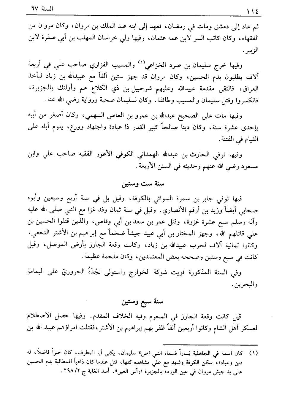 ثم عاد إلى دمشق ومات في رمضان، فعهد إلى ابنه عبد المللك بن مروان، وكان مروان من الفقهاء، وكان كاتب السر لابن عمه عثمان، وفيها ولي خراسان المهلب بن أبي صفرة لابن الزبير. وفيها خرج سليمان بن صرد الخزاعي والمسيب الفزاري صاحب علي في أربعة آلاف يطلبون بدم الحسين، وكان مروان قد جهز ستين ألفاً مع عبيد الله بن زياد ليأخذ العراق، فالتقى مقدمة عبيد الله وعليهم شرحبيل بن ذي الكلاع هم وأولئك بالجزيرة، فانكسروا وقتل سليمان والمسيب وطائفة، وكان لسليمان صحبة ورواية رضي الله عنه. وفيها مات على الصحيح عبد الله بن عمرو بن العاص السهمي، وكان أصغر من أبيه بإحدى عشرة سنة، وكان دينا صالحاً كبير القدر ذا عبادة واجتهاد وورع، يلوم أباه على القيام في الفتنة. وفيها توفي الحارث بن عبد الله الهمداني الكوفي الأعور الفقيه صاحب علي وابن مسعود رضي الله عنهم وحديثه في السنن الأربعة.