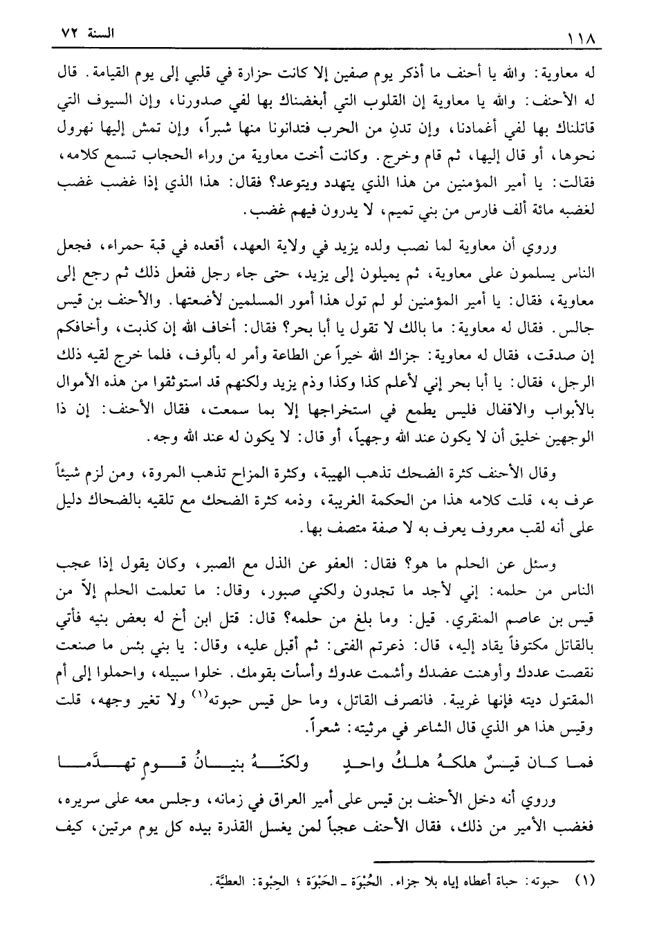له معاوية: والله يا أحنف ما أذكر يوم صفين إلا كانت حزارة في قلبي إلى يوم القيامه. وقال له الأحنف: والله يا معاوية إن القلوب التي أبغضناك بها لفي صدورنا، وإن السيوف اك قاتلناك بها لفي أغمادنا، وإن تدن من الحرب فتدانونا منها شبراً، وإن تمش إليها نهرول نحوها، او قال إليها، ثم قام وخرج. وكانت أخت معاوية من وراء الحجاب تسمع كلامه، فقالت: يا أمير المؤمنين من هذا الذي يتهدد ويتوعد؟ فقال: هذا الذي إذا غضب غضب لغضبه مائة ألف فارس من بني تميم، لا يدرون فيهم غضب. وروي أن معاوية لما نصب ولده يزيد في ولاية العهد، اقعده في قبة حمراء، فجعل الناس يسلمون على معاوية: ثم يميلون إلى يزيد، حتى جاء رجل ففعل ذلك ثم رجع إلى معاوية، فقال: يا أمير المؤمنين لو لم تول هذا أمور المسلمين لأضعتها. والأحنف بن قيس جالس. فقال له معاوية: ما بالك لا تقول يا أبا بحر؟ فقال: اخاف الله إن كذبت، وأخافكم إن صدقت، فقال له معاوية: جزاك الله خيراً عن الطاعة وأمر له بألوف، فلما خرج لقيه ذلك الرجل، فقال: يا أبا بحر إني لأعلم كذا وكذا وذم يزيد ولكنهم قد استوثقوا من هذه الأموال بالأبواب والاقفال فليس يطمع في استخراجها إلا بما سمعت، فقال الأحنف: ان ذ الوجهين خليق أن لا يكون عند الله وجهياً، او قال: لا يكون له عند الله وجه. وقال الأحنف كثرة الضحك تذهب الهيبة، وكثرة المزاح تذهب المروة، من لزم شيئاً عرف به، قلت كلامه هذا من الحكمة الغريبة، وذمه كثرة الضحك مع تلقيه بالضحاك دليل على أنه لقب معروف يعرف به لا صفة متصف بها. وسئل عن الحلم ما هو؟ فقاك: العفو عن الذل مع الصبر، وكان يقول إذا عجب الناس من حلمه. اني لأجد ما تجدون ولكني صبور، وقال: ما تعلمت الحلم إلا من قيس بن عاصم المنقري. قيل: وما بلغ من حلمه؟ قال: قتل ابن أخ له بعض بنيه فأتي بالقاتل مكتوفاً يقاد إليه، قال: ذعرتم الفتى: ثم أقبل عليه، وقال: يا بني بئس ما صنعت نقصت عددك وأوهنت عضدك وأشمت عدوك وأسأت بقومك. خلوا سبيله، واحملوا إلى أم المقتول ديته فإنها غريبة. فانصرف القاتل، وما حل قيس حبوته ولا تغير وجهه، قلت وقيس هذا هو الذي قال الشاعر في مرثيته: شعراً.
