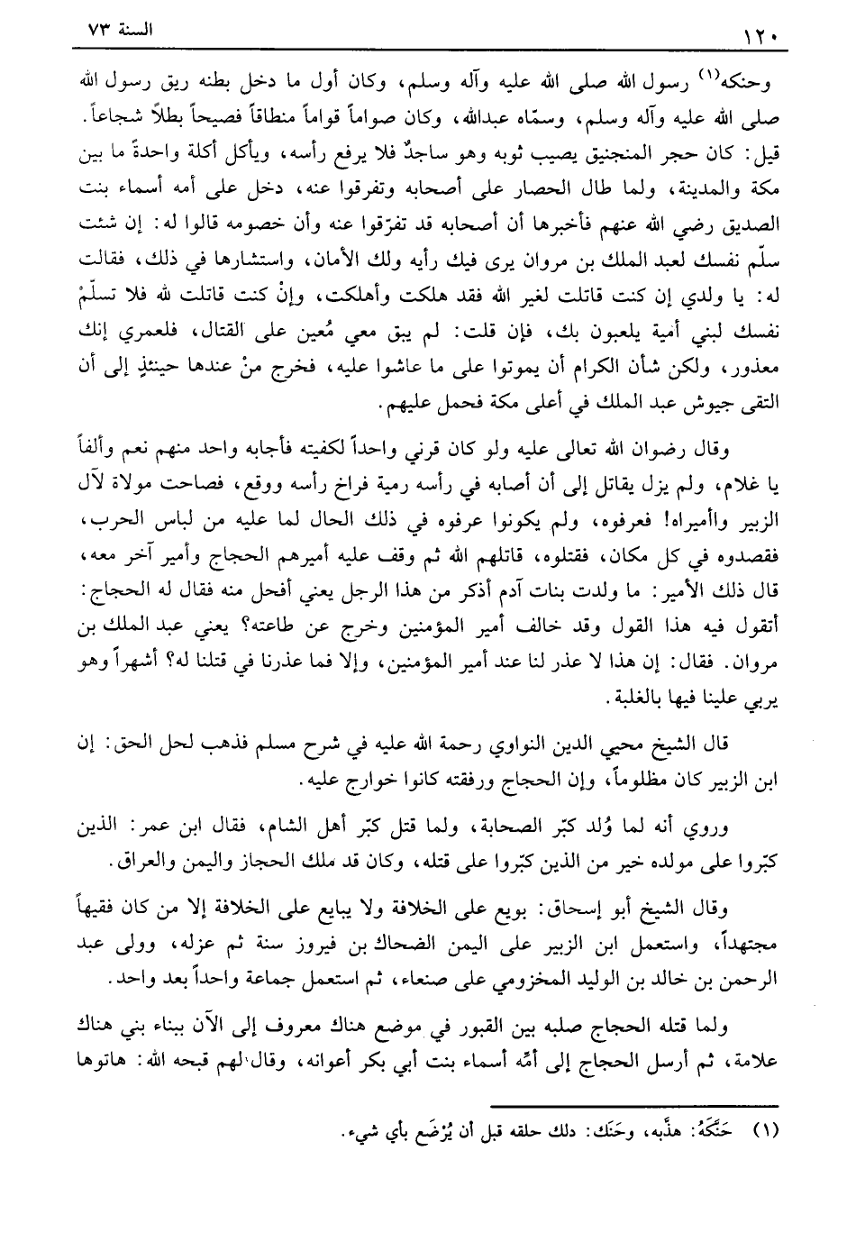 قيل: كان حجر المنجنيق يصيب ثوبه وهو ساجد فلا يرفع رأسه، ويأكل أكلة واحدة ما بين مكة والمدينة، ولما طال الحصار على أصحابه وتفرقوا عنه، دخل على أمه أسماء بنت الصديق رضي الله عنهم فأخبرها أن أصحابه قد تفرقوا عنه وأن خصومه قالوا له: ان شئت سلم نفسك لعبد الملك بن مروان يرى فيك رأيه ولك الأمان، واستشارها في ذلك، فقالت له: يا ولدي إن كنت قاتلت لغير الله فقد هلكت وأهلكت، وإن كنت قاتلت لله فلا تسلم نفسك لبني أمية يلعبون بك، فإن قلت: لم يبق معي معين على القتال، فلعمري إنك معذور، ولكن شأن الكرام أن يموتوا على ما عاشوا عليه، فخرج من عندها حينئذ إلى أن التقى جيوش عبد الملك في أعلى مكة فحمل عليهم. وقال رضوان الله تعالى عليه ولو كان قرني واحداً لكفيته فأجابه واحد منهم نعم وألفاً يا غلام، ولم يزل يقاتل إلى أن أصابه في رأسه رمية فراخ رأسه ووقع، فصاحت مولاة لآل الزبير واأميراه! فعرفوه، ولم يكونوا عرفوه في ذلك الحال لما عليه من لباس الحرب، فقصدوه في كل مكان، فقتلوه، قاتلهم الله ثم وقف عليه أميرهم الحجاج وأمير آخر معه، قال ذلك الأمير: ما ولدت بنات آدم أذكر من هذا الرجل يعني أفحل منه فقال له الحجاج: اتقول فيه هذا القول وقد خالف أمير المؤمنين وخرج عن طاعته؟ يعني عبد الملك بن مروان. فقال: ان هذا لا عذر لنا عند أمير المؤمنين، وإلا فما عذرنا في قتلنا له؟ اشهراً وهو يربي علينا فيها بالغلبة. قال الشيخ محيي الدين النواوي رحمة الله عليه في شرح مسلم فذهب لحل الحق: ان ابن الزبير كان مظلوماً، وإن الحجاج ورفقته كانوا خوارج عليه وروي أنه لما ولد كبر الصحابة، ولما قتل كبر أهل الشام، فقال ابن عمر: الذين كبروا على مولده خير من الذين كبروا على قتله، وكان قد ملك الحجاز واليمن والعراق. وقال الشيخ أبو إسحاق: بويع على الخلافة ولا يبايع على الخلافة إلا من كان فقيها " مجتهدا "، واستعمل ابن الزبير على اليمن الضحاك بن فيروز سنة ثم عزله، وولى عبد الرحمن بن خالد بن الوليد المخزومي على صنعاء، ثم استعمل جماعة واحداً بعد واحد. ولما قتله الحجاج صلبه بين القبور في موضع هناك معروف إلى الآن ببناء بني هناك علامة، ثم أرسل الحجاج إلى أمه أسماء بنت أبي بكر أعوانه، وقال لهم قبحه الله: هاتوها