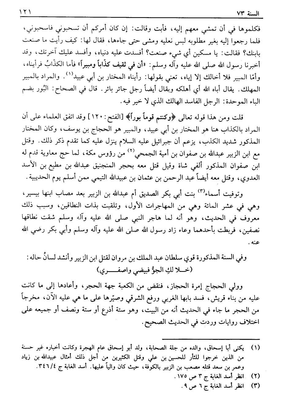 فكلموها في أن تمشي معهم إليه، فأبت وقالت: ان كان أمركم أن تسحبوني فاسحبوني، فلما رجعوا إليه بغير مطلوبه لبس نعليه ومشى حتى جاءها، فقال لها: كيف رأيت ما صنعت با بنك؟ فقالت: يا مسكين أي شيء صنعت؟ افسدت عليه دنياه، وأفسد عليك أخرتك، وقد أخبرنا رسول الله صلى الله عليه وآله وسلم: " أن في ثقيف كذاباً ومبيرأً " فأما الكذاب فرأيناه، وأما المبير فلا أخالك إلا إياه، تعني بقولها: رأيناه المختار بن أبي عبيد. والمراد بالمبير المهلك. يقال أباه الله أي أهلكه ويقال أيضاً رجل جائر بائر. قال في الصحاح: البور بضم الباء الموحدة: الرجل الفاسد الهالك الذي لا خير فيه. قلت ومن هذا قوله تعالى " وكنتم قوماً بوراً " - الفتح: 120 - وقد اتفق العلماء على أن المراد بالكذاب هنا هو المختار بن أبي عبيد، والمبير هو الحجاج بن يوسف، وكان المختار المذكور شديد الكذب، يزعم أن جبرائيل عليه السلام ينزل عليه كما تقدم ذكر ذلك. وقتل مع ابن الزبير عبد الله بن صفوان بن أمية الجمحي من رؤوس مكة، لما حج معاوية قدم له ابن صفوان المذكور ألفي شاة وقيل قتل معه بحجر المنجنيق عبد الله بن مطيع بن الأسد العدوي، وقتل معه أيضاً عبد الرحمن بن عثمان بن عبيد الله التيمي ممن أسلم يوم الحديبية. وتوفيت أسماء بنت أبي بكر الصديق أم عبد الله بن الزبير بعد مصاب ابنها بيسير، وهي في عشر المائة وهي من المهاجرات الأول، وتلقبت بذات النطاقين، وسبب ذلك معروف في الحديث، وهو أنه لما هاجر النبي صلى الله عليه وآله وسلم شقت نطاقها نصفين، فربطت بأحدهما وعاء زاد رسول الله صلى الله عليه وآله وسلم وأبي بكر رضي الله عنه. وفي السنة المذكورة قوي سلطان عبد الملك بن مروان لقتل ابن الزبير وأنشد لسان حاله: خلا لك الجو فبيضي واصفري