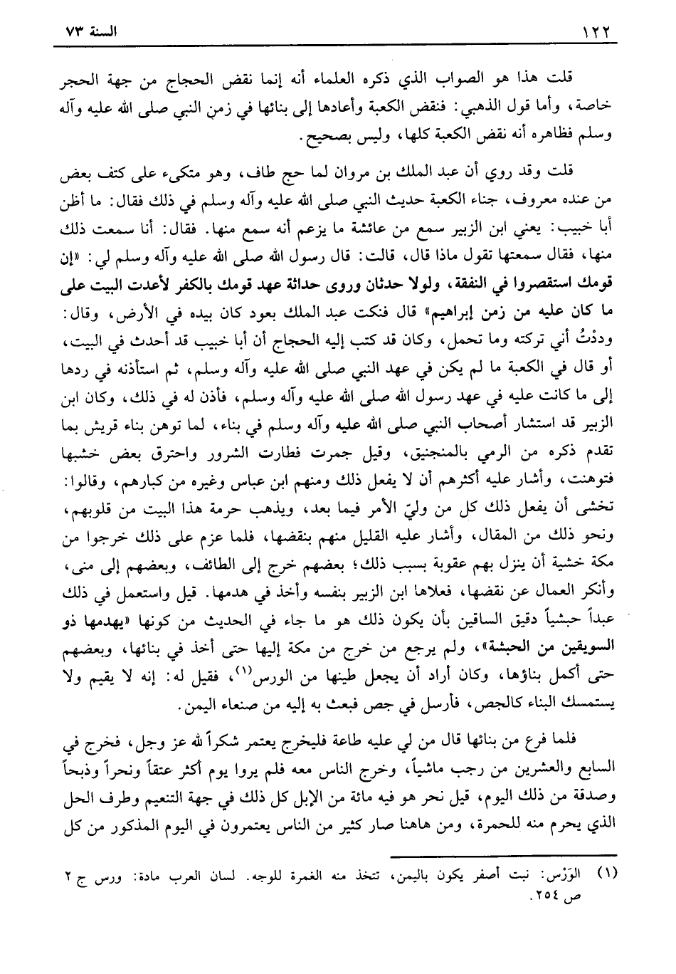 قلت هذا هو الصواب الذي ذكره العلماء أنه إنما نقض الحجاج من جهة الحجر خاصة، وأما قول الذهبي: فنقض الكعبة وأعادها إلى بنائها في زمن النبي صلى الله عليه وآله وسلم فظاهره أنه نقض الكعبة كلها، وليس بصحيح. قلت وقد روي أن عبد الملك بن مروان لما حج طاف، وهو متكىء على كتف بعض من عنده معروف، جناء الكعبة حديث النبي صلى الله عليه وآله وسلم في ذلك فقال: ما أظن أبا خبيب: يعني ابن الزبير سمع من عائشة ما يزعم أنه سمع منها. فقال: انا سمعت ذلك منها، فقال سمعتها تقول ماذا قال، قالت: قال رسول الله صلى الله عليه وآله وسلم لي: " إن قومك استقصروا في النفقة، ولولا حدثان وروى حداثة عهد قومك بالكفر لأعدت البيت على ما كان عليه من زمن إبراهيم " قال فنكت عبد الملك بعود كان بيده في الأرض، وقال: وددت أني تركته وما تحمل، وكان قد كتب إليه الحجاج أن أبا خبيب قد أحدث في البيت، او قال في الكعبة ما لم يكن في عهد النبي صلى الله عليه وآله وسلم، ثم استأذنه في ردها إلى ما كانت عليه في عهد رسول الله صلى الله عليه وآله وسلم، فأذن له في ذلك، وكان ابن الزبير قد استشار أصحاب النبي صلى الله عليه وآله وسلم في بناء، لما توهن بناء قريش بما تقدم ذكره من الرمي بالمنجنيق، وقيل جمرت فطارت الشرور واحترق بعض خشبها فتوهنت، وأشار عليه أكثرهم أن لا يفعل ذلك ومنهم ابن عباس وغيره من كبارهم، وقالوا: تخشى أن يفعل ذلك كل من ولي الأمر فيما بعد، ويذهب حرمة هذا البيت من قلوبهم، ونحو ذلك من المقال، وأشار عليه القليل منهم بنقضها، فلما عزم على ذلك خرجوا من مكة خشية أن ينزل بهم عقوبة بسبب ذلك، بعضهم خرج إلى الطائف، وبعضهم إلى منى، وأنكر العمال عن نقضها، فعلاها ابن الزبير بنفسه وأخذ في هدمها. قيل واستعمل في ذلك عبداً حبشياً دقيق الساقين بأن يكون ذلك هو ما جاء في الحديث من كونها " يهدمها ذو السويقين من الحبشة "، ولم يرجع من خرج من مكة إليها حتى أخذ في بنائها، وبعضهم حتى أكمل بناؤها، وكان أراد أن يجعل طينها من الورس، قيل له: انه لا يقيم ولا يستمسك البناء كالجص، فأرسل في جص فبعث به إليه من صنعاء اليمن. فلما فرع من بنائها قال من لي عليه طاعة فليخرج يعتمر شكراً لله عز وجل، فخرج في السابع والعشرين من رجب ماشياً، وخرج الناس معه فلم يروا يوم أكثرعتقاً ونحراً وذبحاً وصدقة من ذلك اليوم، قيل نحرهو فيه مائة من الإبل كل ذلك في جهة التنعيم وطرف الحل الذي يحرم منه للحمرة، ومن هاهنا صار كثير من الناس يعتمرون في اليوم المذكور من كل