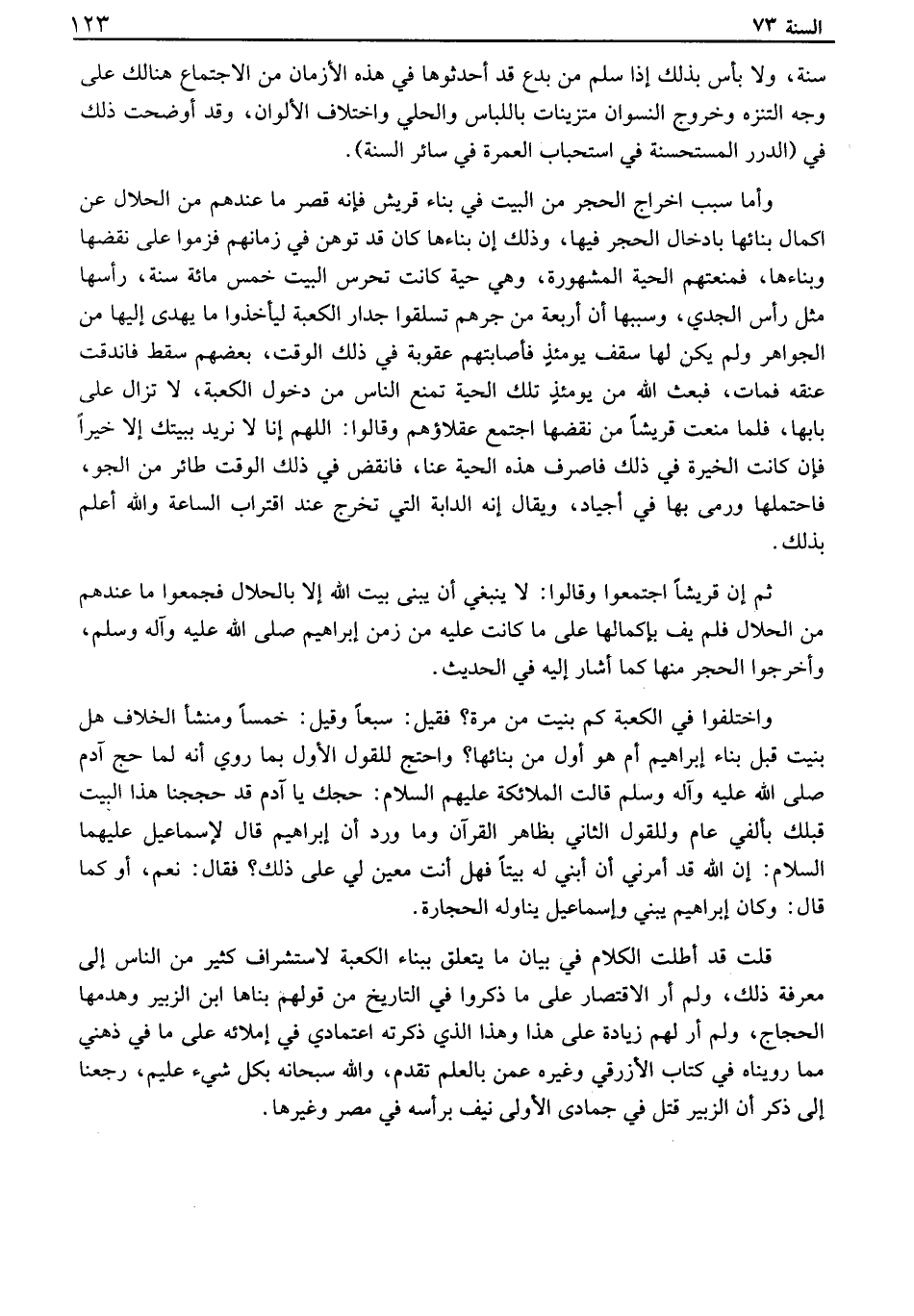 سنة ولا بأس بذلك إذا سلم من بدع قد أحدثوها في هذه الأزمان من الأجتماع هنالك على وجه التنزه وخروج النسوان متزينات باللباس والحلي واختلاف الألوان، وقد أوضحت ذلك في " الدررالمستحسنة في استحباب العمرة في سائر السنة ". وأما سبب اخراج الحجرمن البيت في بناء قريش فإنه قصر ما عندهم من الحلال عن اكمال بنائها بادخال الحجر فيها، وذلك إن بناءها كان قد توهن في زمانهم فزموا علىنقضها وبناءها، فمنعتهم الحية المشهورة، وهي حية كانت تحرس البيت خمس مائة سنة، رأسها مثل رأس الجدي، وسببها أن أربعة من جرهم تسلقوا جدار الكعبة ليأخذوا ما يهدى إليها من الجواهرولم يكن لها سقف يومئذ فأصابتهم عقوبة في ذلك الوقت، بعضهم سقط فاندقت عنقه فمات، فبعث الله من يومئذ تلك الحية تمنع الناس من دخول الكعبة، لا تزال على بابها، فلما منعت قريشاً من نقضها اجتمع عقلاؤهم وقالوا: اللهم إنا لا نريد ببيتك إلا خيراً فان كانت الخيرة في ذلك فاصرف هذه الحية عنا، فانقض في ذلك الوقت طائر من الجو، فاحتملها ورمى بها في أجياد، ويقال إنه الدابة التي تخرج عند اقتراب الساعة والله أعلم بذلك. ثم إن قريشاً اجتمعوا وقالوا: لا ينبغي أن يبنى بيت الله إلا بالحلال فجمعوا ما عندهم من الحلال فلم يف بإكمالها على ما كانت عليه من زمن ابراهيم صلى الله عليه وآله وسلم، وأخرجوا الحجر منها كما أشار إليه في الحديث. واختلفوا في الكعبة كم بنيت من مرة؟ فقيل: سبعاً وقيل: خمساً ومنشأ الخلاف