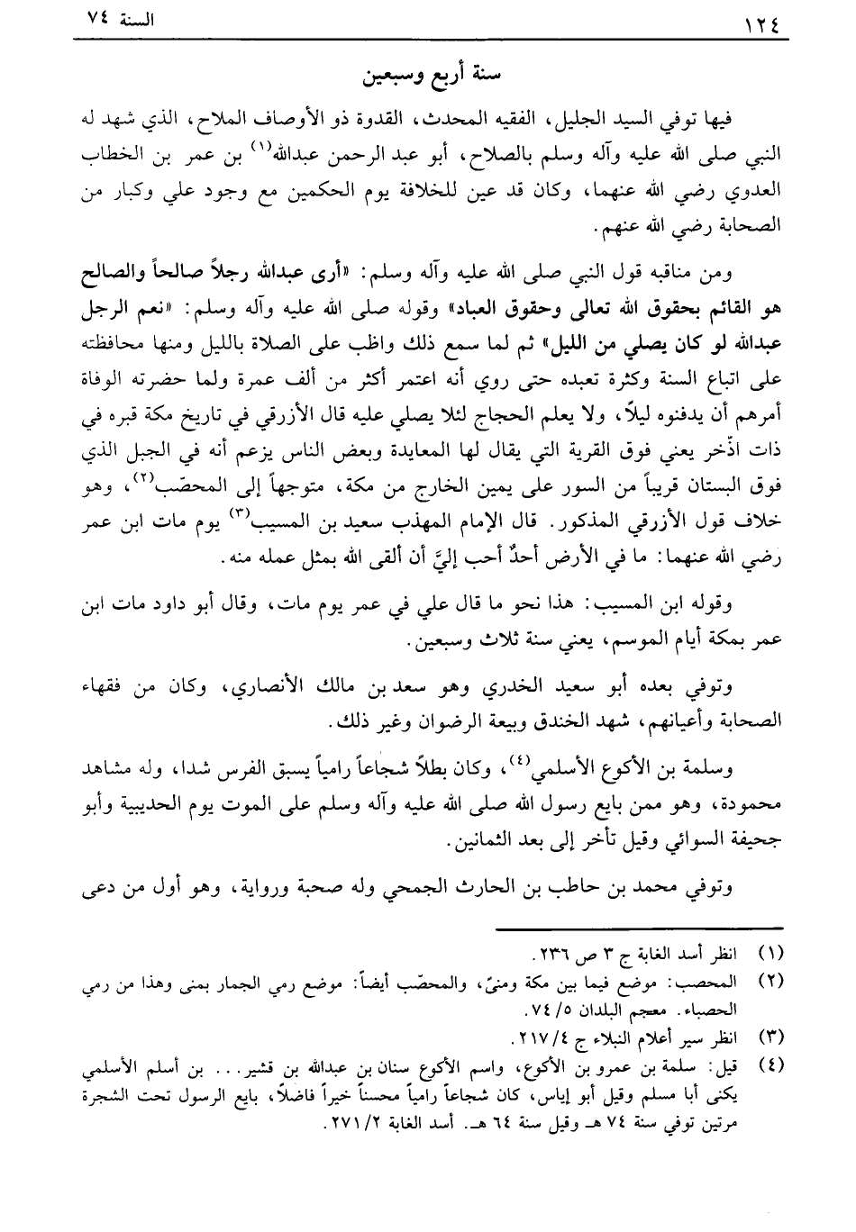 وقوله ابن المسيب: هذا نحو ما قال علي في عمر يوم مات، وقال أبو داود مات ابن عمر بمكة أيام الموسم، يعني سنة ثلاث وسبعين. وتوفي بعده أبو سعيد الخدري وهو سعد بن مالك الأنصاري، وكان من فقهاء الصحابة وأعيانهم، شهد الخندق وبيعة الرضوان وغير ذلك. وسلمة بن الأكوع الأسلمي، كان بطلاً شجاعاً رامياً يسبق الفرس شدا، وله مشاهد محمودة، وهو ممن بايع رسول الله صلى الله عليه وآله وسلم على الموت يوم الحديبية وأبو جحيفة السوائي وقيل تأخر إلى بعد الثمانين. وتوفي محمد بن حاطب بن الحارث الجمحي وله صحبة ورواية، وهو أول من دعى