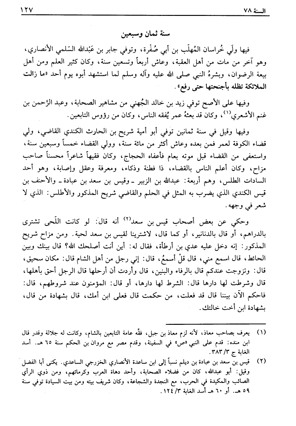 فيها ولي خراسان المهلب بن أبي صفرة، وتوفي جابر بن عبد الله السلمي الأنصاري، وهو آخر من مات من أهل العقبة، وعاش أربعاً وتسعين سنة، وكان كثير العلم ومن أهل بيعة الرضوان، وبشره النبي صلى الله عليه وآله وسلم لما استشهد أبوه يوم أحد " مازلت الملائكة تظله بأجنحتها حتى رفع ". وفيها على الأصح توفي زيد بن خالد الجهني من مشاهيرالصحابة، وعبد الرحمن بن غنم الأشعري، كان قد بعثه عمر يفقه الناس، وكان من رؤوس التابعين. وفيها وقيل في سنة ثمانين توفي أبو أمية شريح بن الحارث الكندي القاضي، ولي قضاء الكوفة لعمر فمن بعده وعاش أكثر من مائة سنة، وولي القضاء خمساً وسبعين سنة، واستعفى من القضاء قبل موته بعام فأعفاه الحجاج، وكان فقيهاً شاعراً محسناًَ صاحب مزاح، وكان أعلم الناس بالقضاء، ذا فطنة وذكاء، ومعرفة وعقل وإصابة، وهو أحد السادات الطلس، وهم أربعة: عبد الله بن الزبير - وقيسى بن سعد بن عبادة - والأحنف بن قيس الكندي الذي يضرب به المثل في الحلم والقاضي شريح المذكور والأطلس: الذي شعر في وجهه. وحكي عن بعض أصحاب قيس بن سعد أنه قال: لو كانت اللحى تشترى بالدراهم، او قال بالدنانير، او كما قال، لاشترينا لقيس بن سعد لحية. ومن مزاح شريح المذكور: انه دخل عليه عدي بن أرطأة، فقال له: اين أنت أصلحك الله؟ قال بينك وبين الحائط، قال اسمع مني، قال قل أسمع، قال: اني رجل من أهل الشام قال: مكان سحيق، قال: وتزوجت عندكم قال بالرفاء والبنين، قال وأردت أن أرحلها قال الرجل أحق بأهلها، قال وشرطت لها دارها قال: الشرط لها دارها، او قال: المؤمنون عند شروطهم، قال: فاحكم الآن بيننا قال قد فعلت، من حكمت قال فعلى ابن أمك، قال بشهادة من قال، بشهادة ابن أخت خالتك.