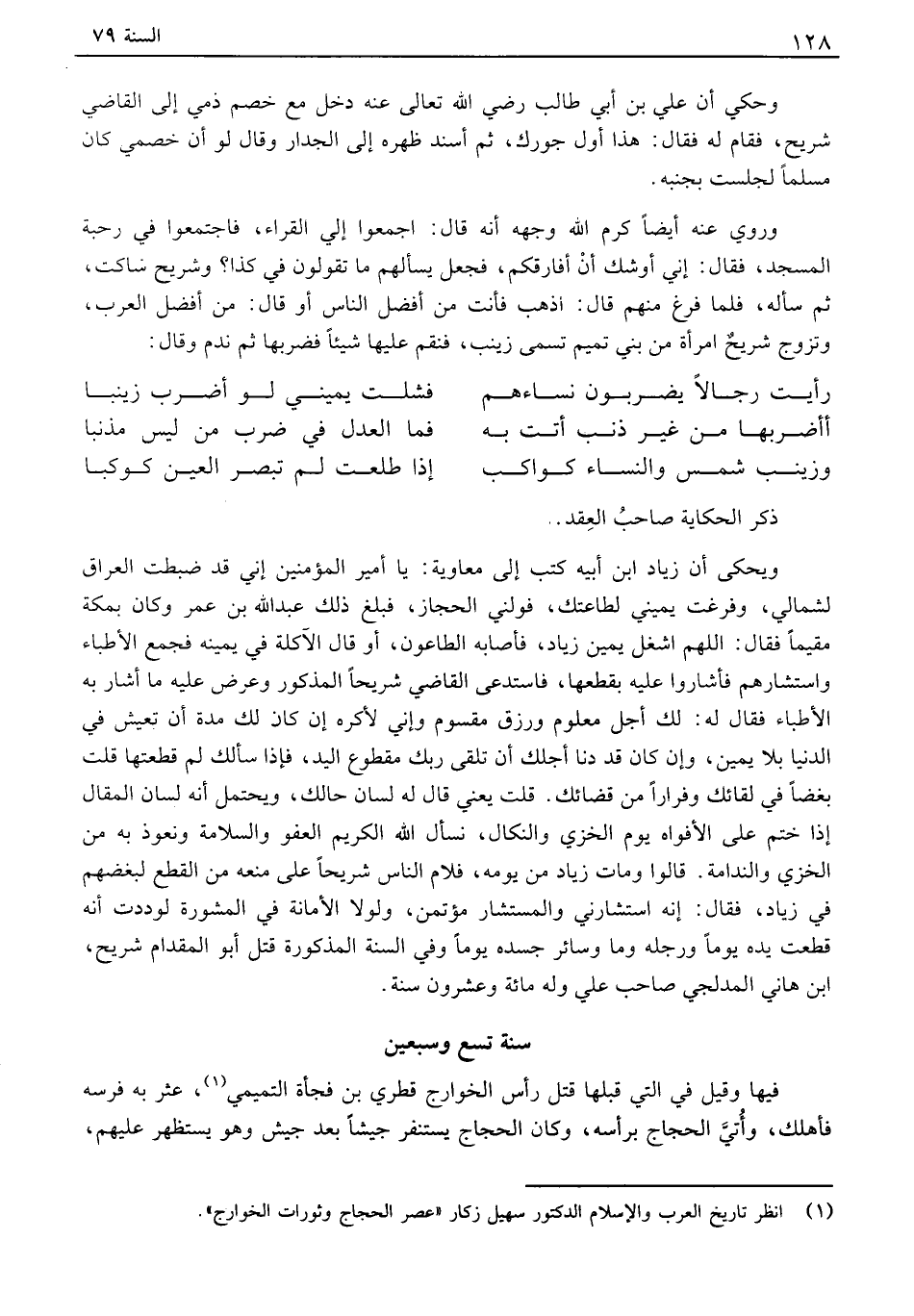 فيها وقيل في التي قبلها قتل رأس الخوارج قطري بن فجأة التميمي، ثر به فرسه فأهلك، وأتي الحجاج برأسه، وكان الحجاج يستنفر جيشاً بعد جيش وهو يستظهر عليهم،
