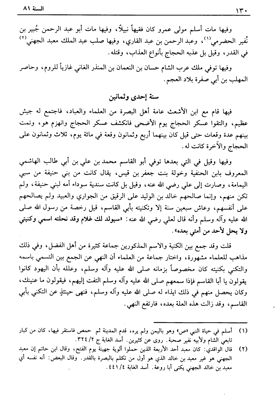 فيها قام مع ابن الأشعث عامة أهل البصرة من العلماء والعباد، فاجتمع له جيش عظيم، والتقوا عسكر الحجاج يوم الأضحى فانكشف عسكر الحجاج وانهزم هو، وتمت بينهم عدة وقعات حتى قيل كان بينهما أربع وثمانون وقعة في مائة يوم، ثلاث وثمانون على الحجاج والآخرة كانت له. وفيها وقيل في التي بعدها توفي أبو القاسم محمد بن علي بن أبي طالب الهاشمي المعروف بابن الحنفية وخولة بنت جعفر بن قيس، يقال كانت من بني حنيفة من سبي اليمامة، وصارت إلى علي رضي الله عنه، وقيل بل كانت سندية سوداء أمه لبني حنيفة، ولم تكن منهم، وإنما صالحهم خالد بن الوليد على الرقيق من الجواري والعبيد ولم يصالحهم على أنفسهم، وعاش سبعين سنة إلا وتكنيته بأبي القاسم، قيل رخصة من رسول الله صلى الله عليه وآله وسلم وأنه قال لعلي رضي الله عنه: " سيولد لك غلام وقد نحلته اسمي وكنيتي ولا يحل لأحد من أمتي بعده ". قلت وقد جمع بين الكنية والاسم المذكورين جماعة كثيرة من أهل الفضل، وفي ذلك مذاهب للعلماء مشهورة، واختار جماعة من العلماء أن النهي عن الجمع بين التسمي باسمه والتكني بكنيته كان مخصوصاً بزمانه صلى الله عليه وآله وسلم، وعلله بأن اليهود كانوا يقولون يا أبا القاسم فإذا سمعهم صلى الله عليه وآله وسلم التفت إليهم، فيقولون ما عنينك، وكان يحصل منهم في ذلك ايذاء له صلى الله عليه وآله وسلم، فنهى حينئذ عن التكني بأبي القاسم، وقد زالت هذه العلة بعده، فارتفع النهي.