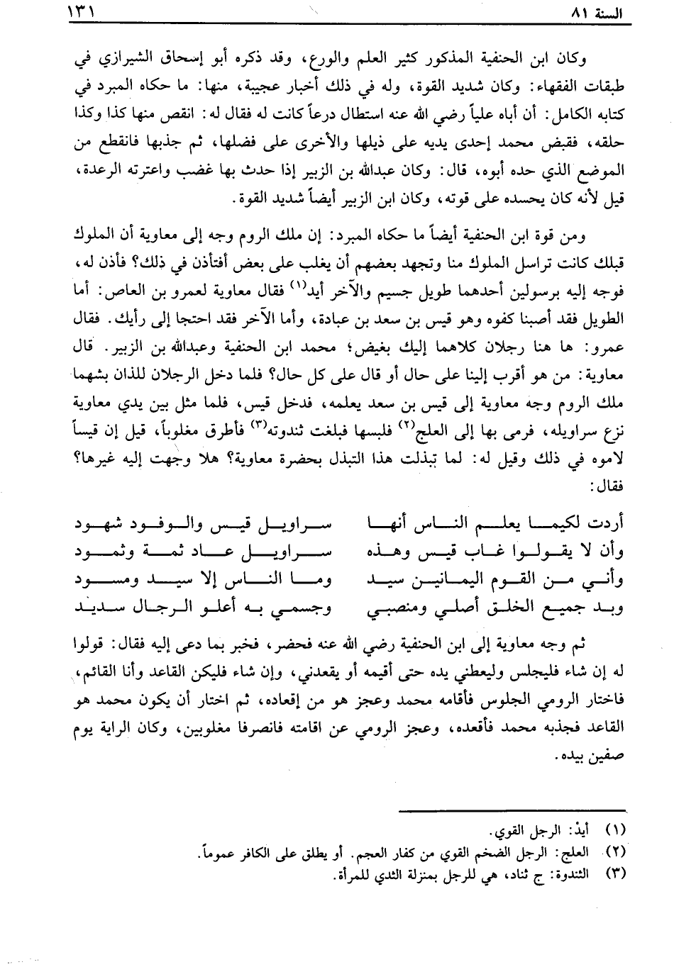 ثم وجه معاوية إلى ابن الحنفية رضي الله عنه فحضر، فخبر بما دعى إليه فقال: قولوا له إن شاء فليجلس وليعطني يده حتى أقيمه أو يقعدني، وإن شاء فليكن القاعد وأنا القائم، فاختار الرومي الجلوس فأقامه محمد وعجز هو من إقعاده، ثم اختار أن يكون محمد هو القاعد فجذبه محمد فأقعده، وعجز الرومي عن اقامته فانصرفا مغلوبين، وكان الراية يوم صفين بيده.