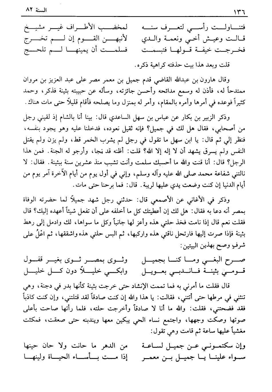 قلت وبعد هذا بيت حذفته كراهية ذكره. وقال هارون بن عبد الله القاضي قدم جميل بن معمر مصر على عبد العزيز بن مروان ممتدحاً له، فأذن له وسمع مدائحه وأحسن جائزته، وسأله عن حبيبته بثينة فذكر، وحمد كثيراً فوعده في أمرها وأمره بالمقام، وأمر له بمنزل وما يصلحه فأقام قليلاً حتى مات هناك. وذكر الزبير بن بكار عن عباس بن سهل الساعدي قال: بينا أنا بالشام إذ لقيني رجل من أصحابي، فقال هل لك في جميل؟ فإنه ثقيل نعوده، فدخلنا عليه وهو يجود بنفسه، فنظر إلي ثم قال: يا ابن سهل ما تقول في رجل لم يشرب الخمر قط، ولم يزن ولم يقتل النفس ولم يسرق يشهد أن لا إله إلا الله؟ قلت: اظنه قد نجا، وأرجو له الجنة. فمن هذا الرجل؟ قال: انا قنت والله ما أحسبك سلمت وأنت تشبب منذ عشرين سنة ببثينة. فقال: لا نالتني شفاعة محمد صلى الله عليه وآله وسلم، وإني في أول يوم من أيام الآخرة آمر يوم من أيام الدنيا إن كنت وضعت يدي عليها لريبة. قال: فما برحنا حتى مات. وذكر في الأغاني عن الأصمعي قال: حدثني رجل شهد جميلاً لما حضرته الوفاة بمصر أنه دعا به فقال: هل لك إن أعطيتك كل ما أخلفه على أن تفعل شيئاً أعهده إليك؟ قال فقلت نعم قال إذا نامت فخذ حلتي هذه وأعز لها جانباً وكل ما سواها، لك وادمل إلى رهط بثينة فإذا صرت إليها فارتحل ناقتي هذه واركبها، ثم البس حلتي هذه واشققها، ثم اعل على شرف وصح بهذين البيتين: