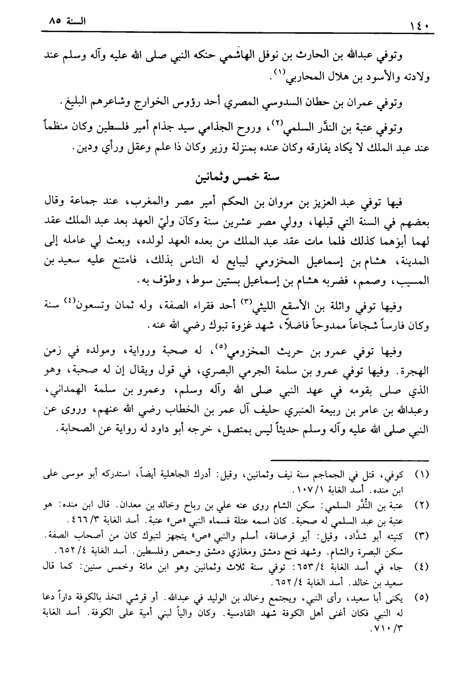 فيها توفي عبد العزيز بن مروان بن الحكم أمير مصر والمغرب، عند جماعة وقال بعضهم في السنة التي قبلها، وولي مصر عشرين سنة وكان ولي العهد بعد عبد الملك عقد لهما أبوهما كذلك فلما مات عقد عبد الملك من بعده العهد لولده، وبعث لي عامله إلى المدينة، هشام بن إسماعيل المخزومي ليبايع له الناس بذلك، فامتنع عليه سعيد بن المسيب، وصمم، فضربه هشام بن إسماعيل بستين سوط، وطوف به. وفيها توفي واثلة بن الأسقع الليثي أحد فقراء الصفة، وله ثمان وتسعون سنة وكان فارساً شجاعاً ممدوحاً فاضلاً، شهد غزوة تبوك رضي الله عنه. وفيها توفي عمرو بن حريث المخزومي، هـ صحبة ورواية، ومولده في زمن الهجرة. وفيها توفي عمرو بن سلمة الجرمي البصري، في قول ويقال إن له صحبة، وهو الذي صلى بقومه في عهد النبي صلى الله وآله وسلم، وعمرو بن سلمة الهمداني، وعبد الله بن عامر بن ربيعة العنبري حليف آل عمر بن الخطاب رضي الله عنهم، وروى عن النبي صلى الله عليه وآله وسلم حديثاً ليس بمتصل، خرجه أبو داود له رواية عن الصحابة.