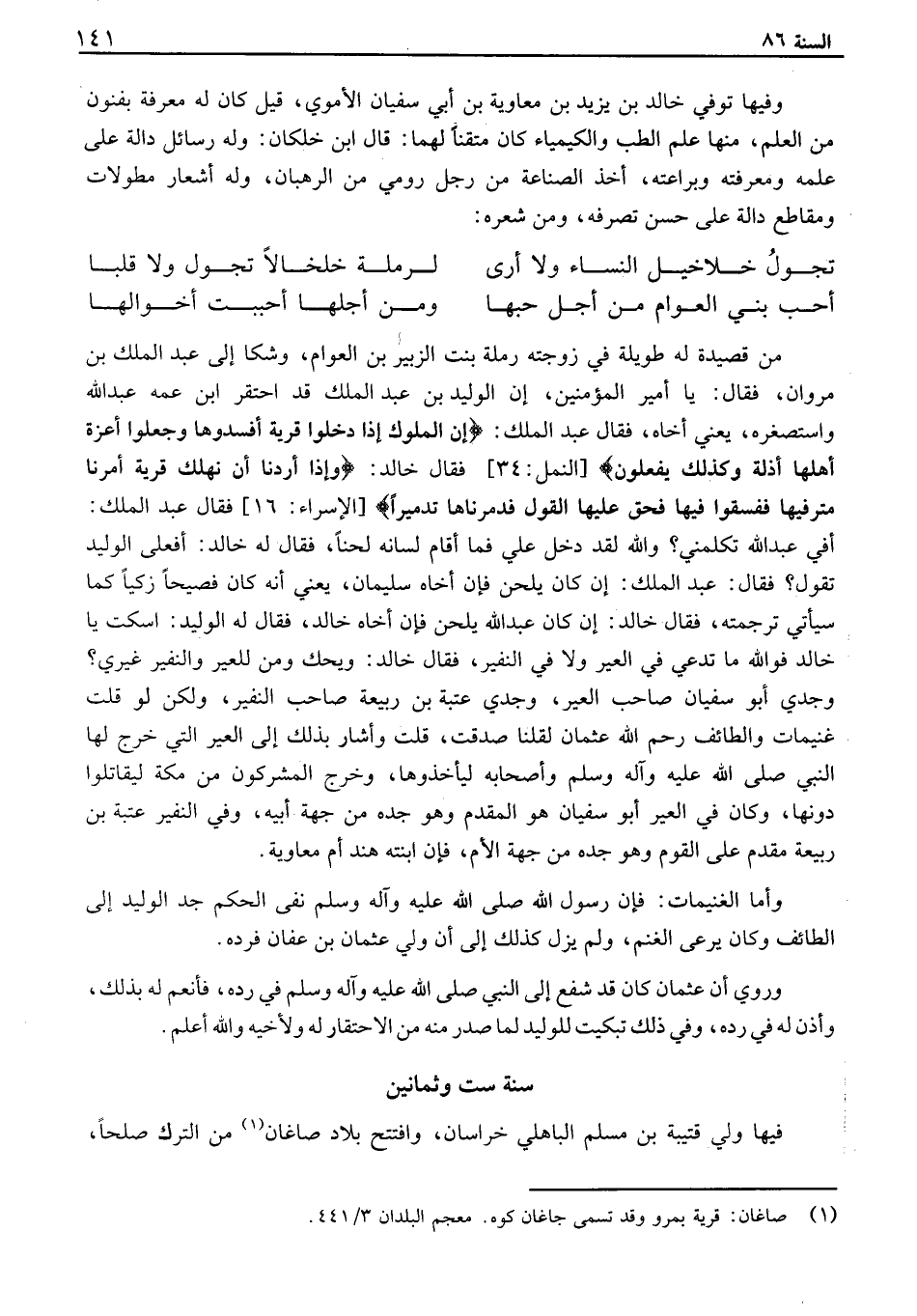 فيها ولي قتيبة بن مسلم الباهلي خراسان، وافتتح بلاد صاغان من الترك صلحاً،